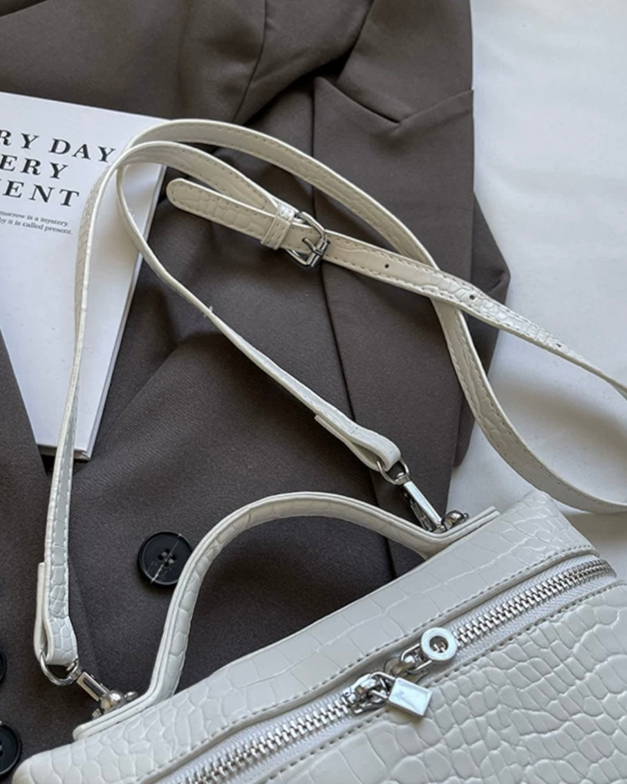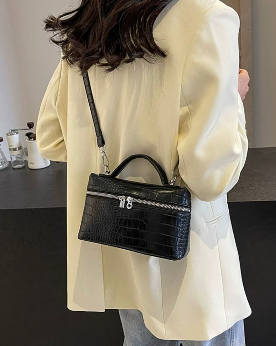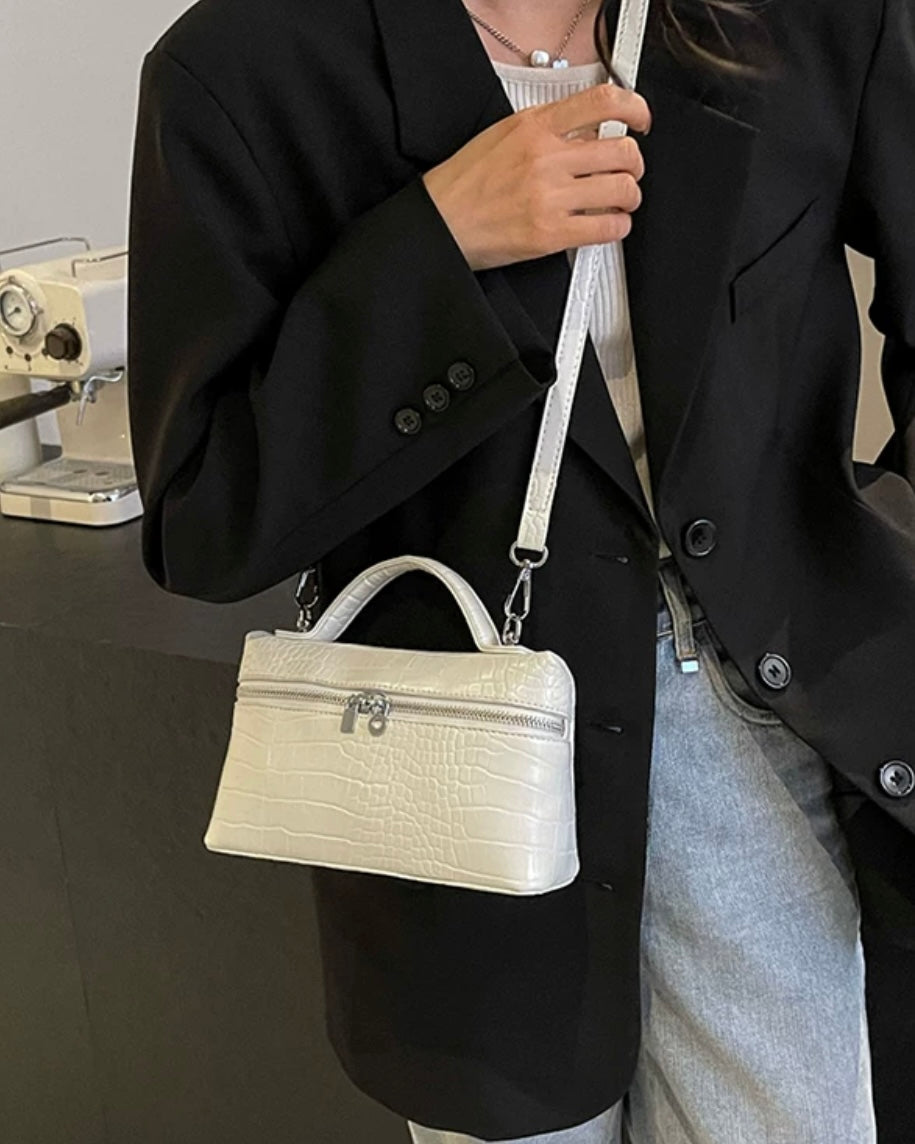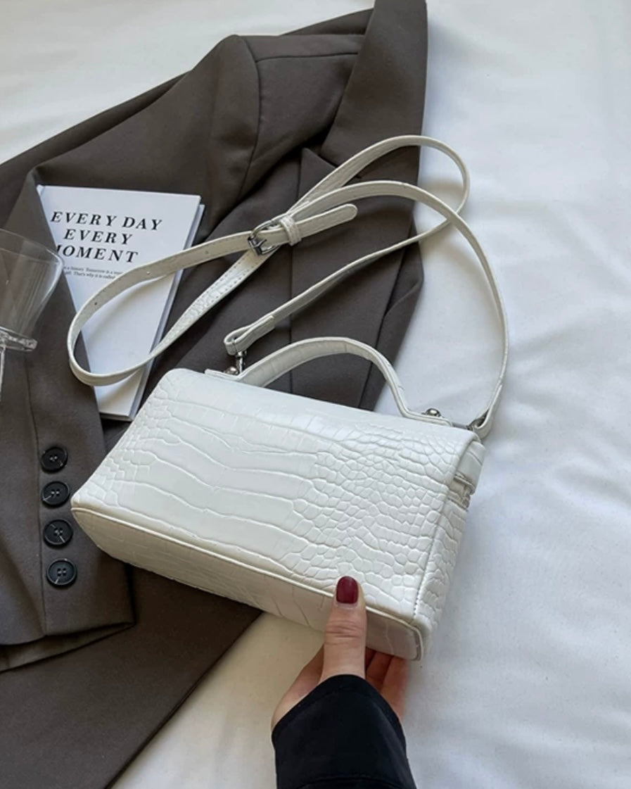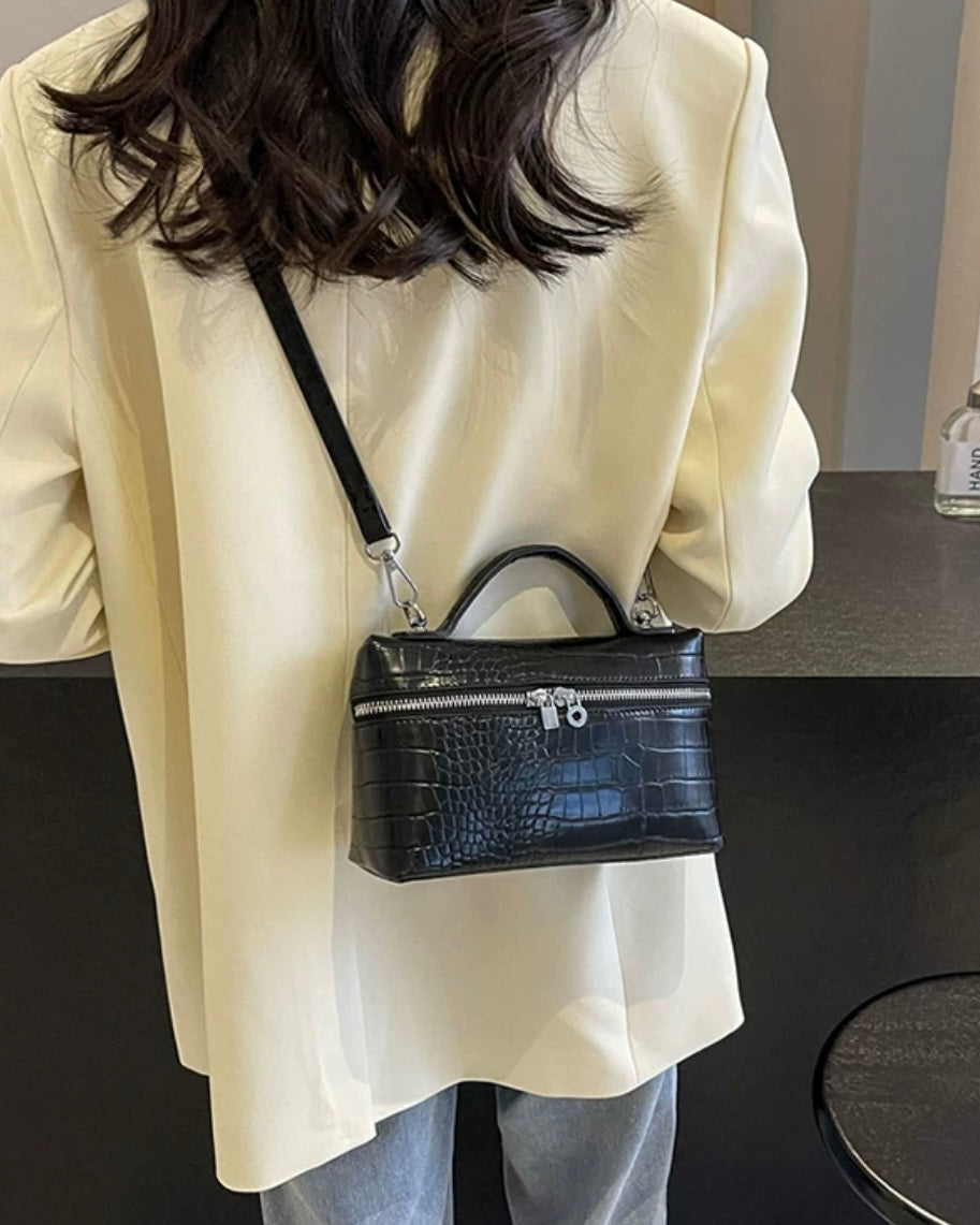 共地のクロコ型押しショルダーベルトが女性らしく上品な印象に。カジュアルも綺麗めコーデにもぴったりなデザイン。