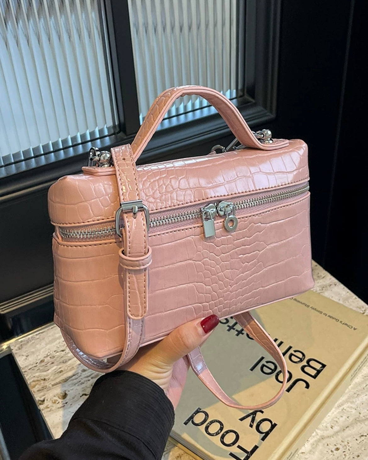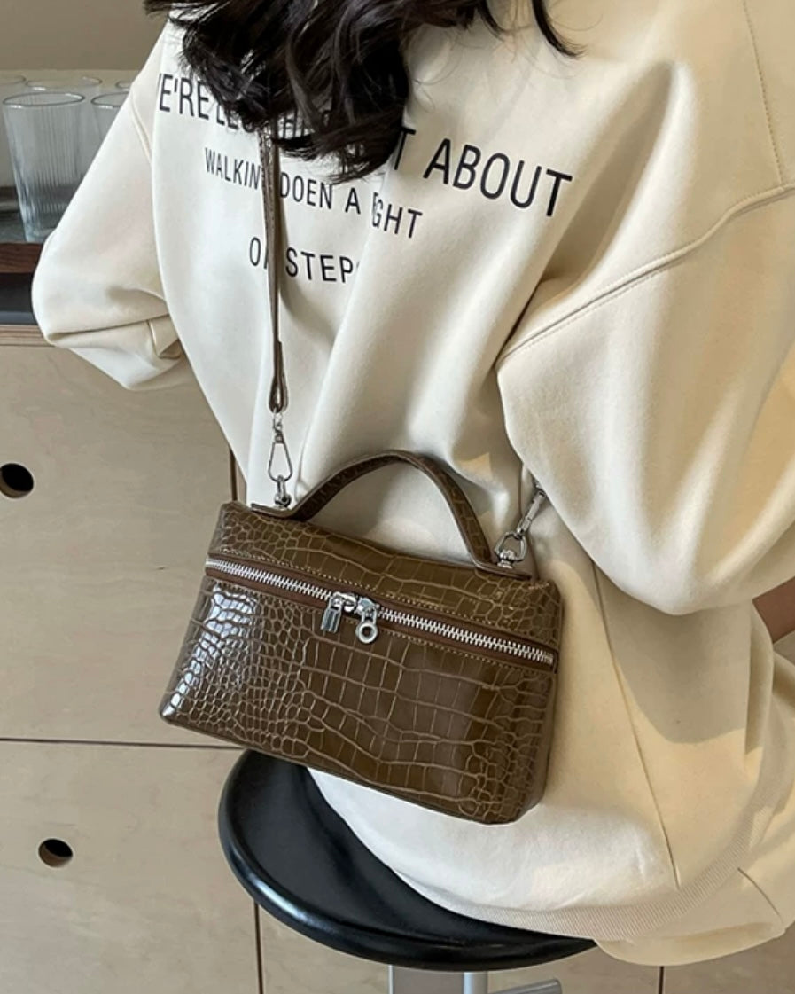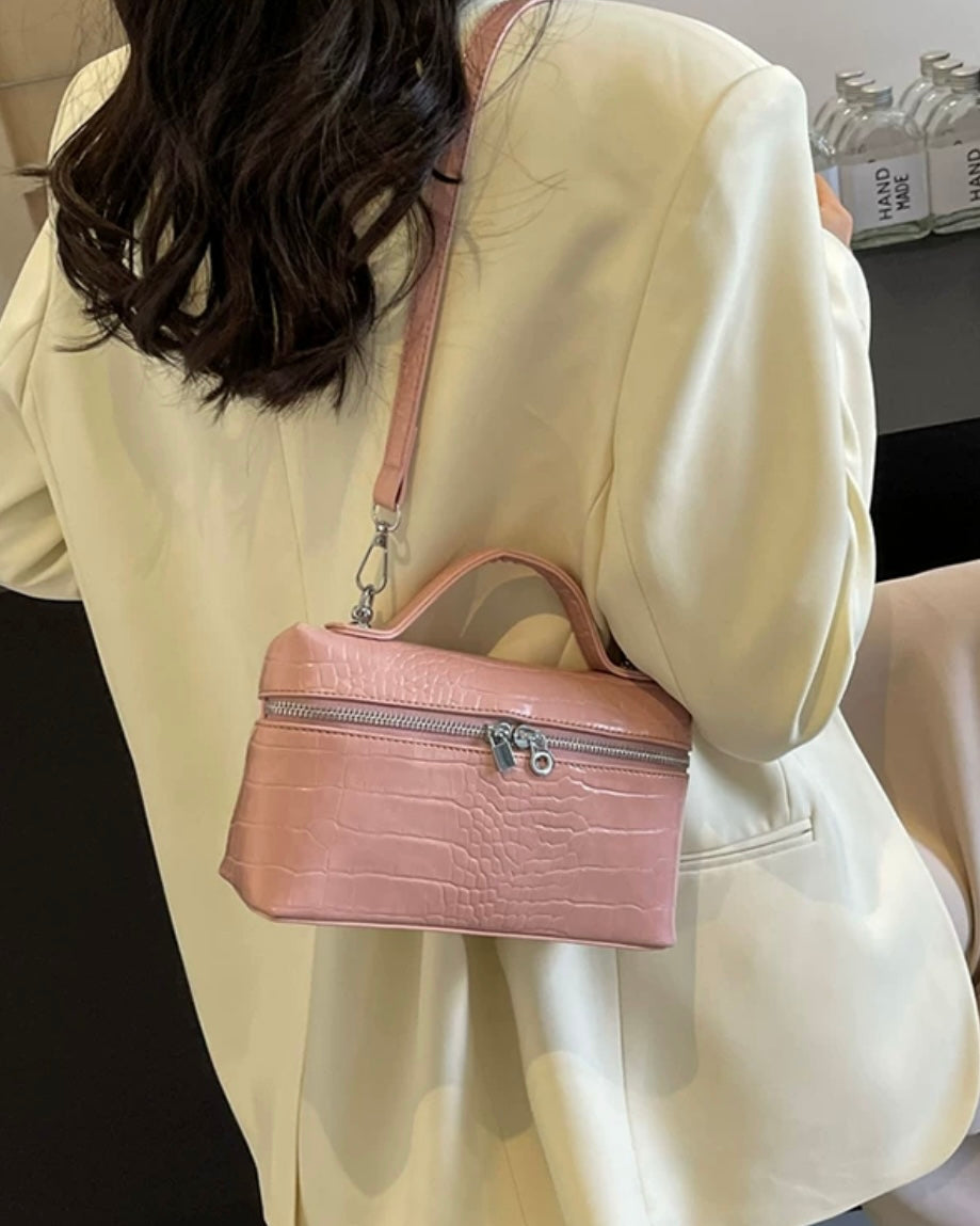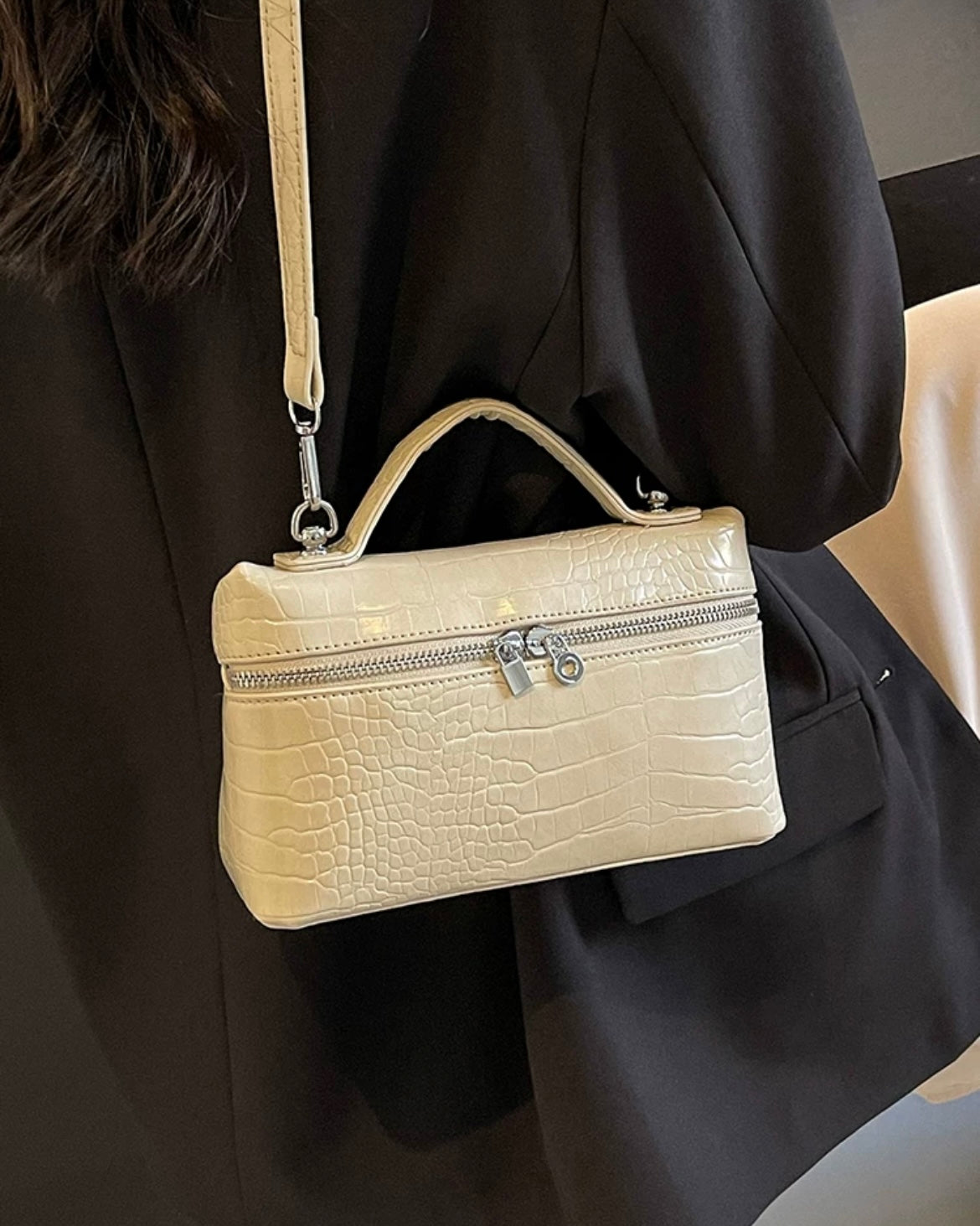 共地のクロコ型押しショルダーベルトが女性らしく上品な印象に。カジュアルも綺麗めコーデにもぴったりなデザイン。