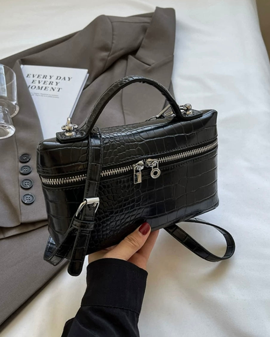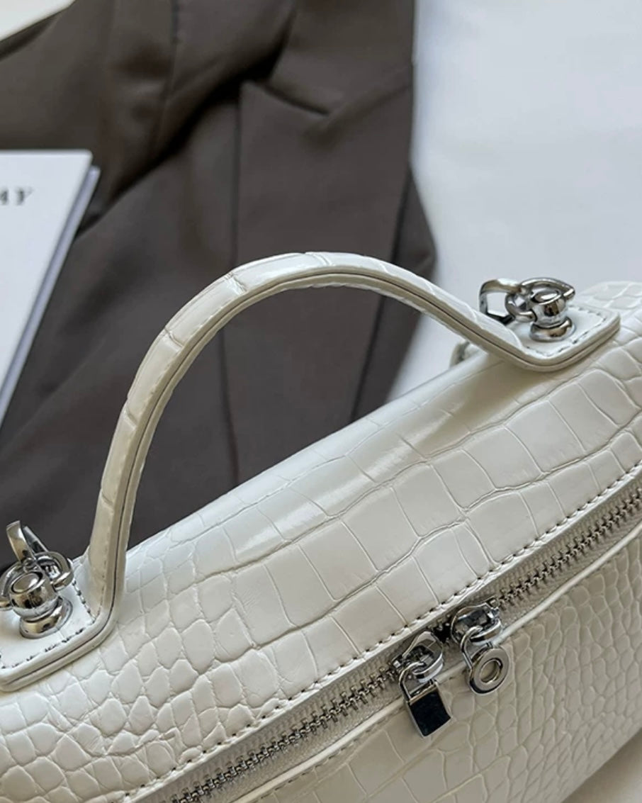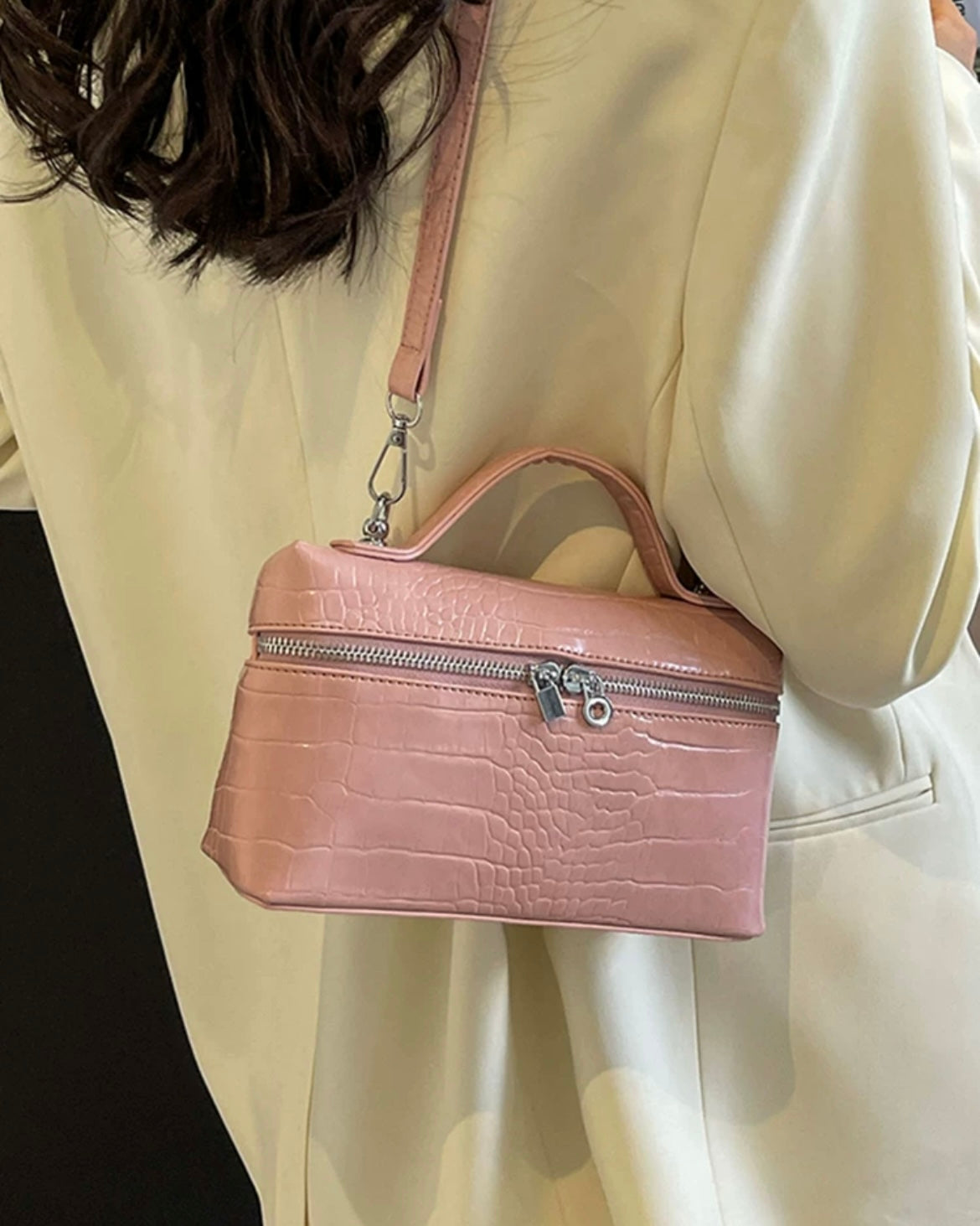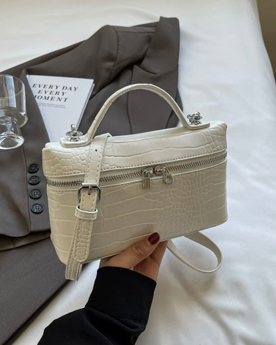 共地のクロコ型押しショルダーベルトが女性らしく上品な印象に。カジュアルも綺麗めコーデにもぴったりなデザイン。