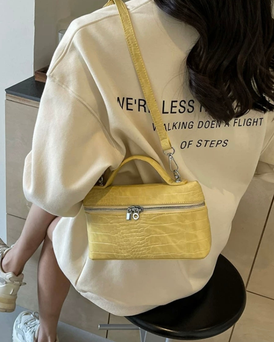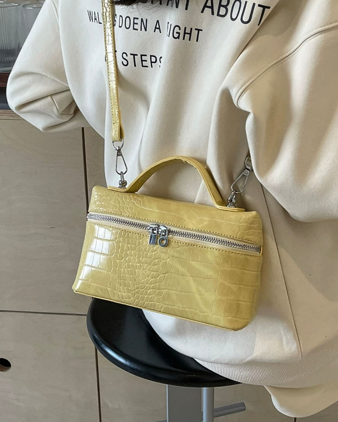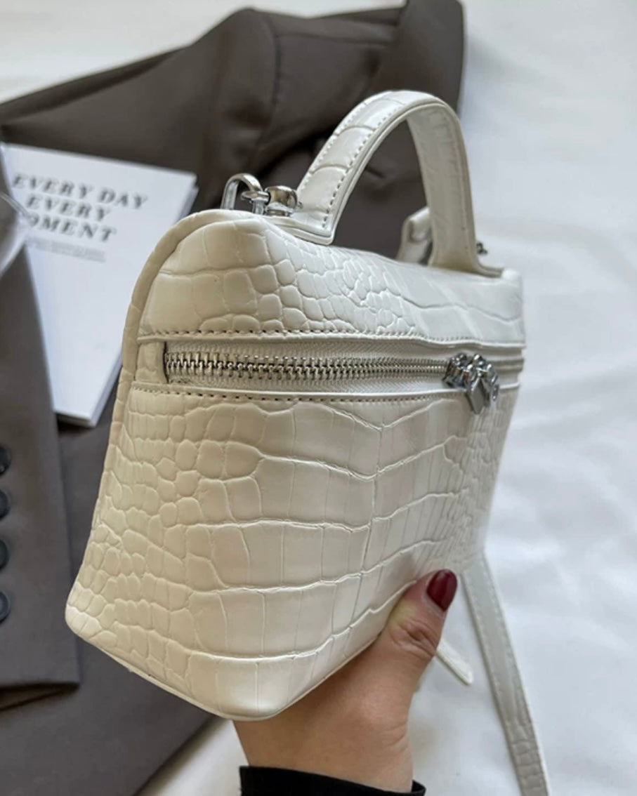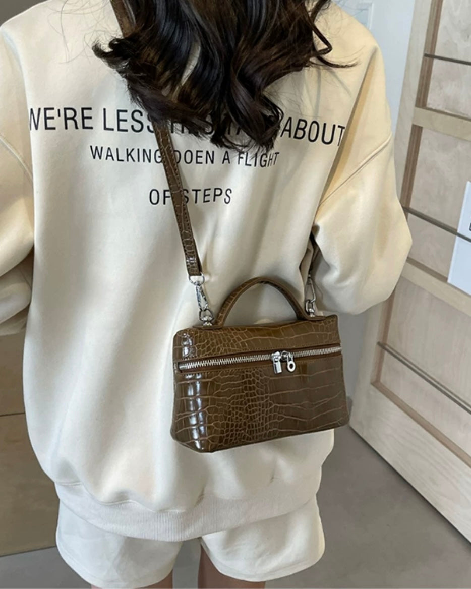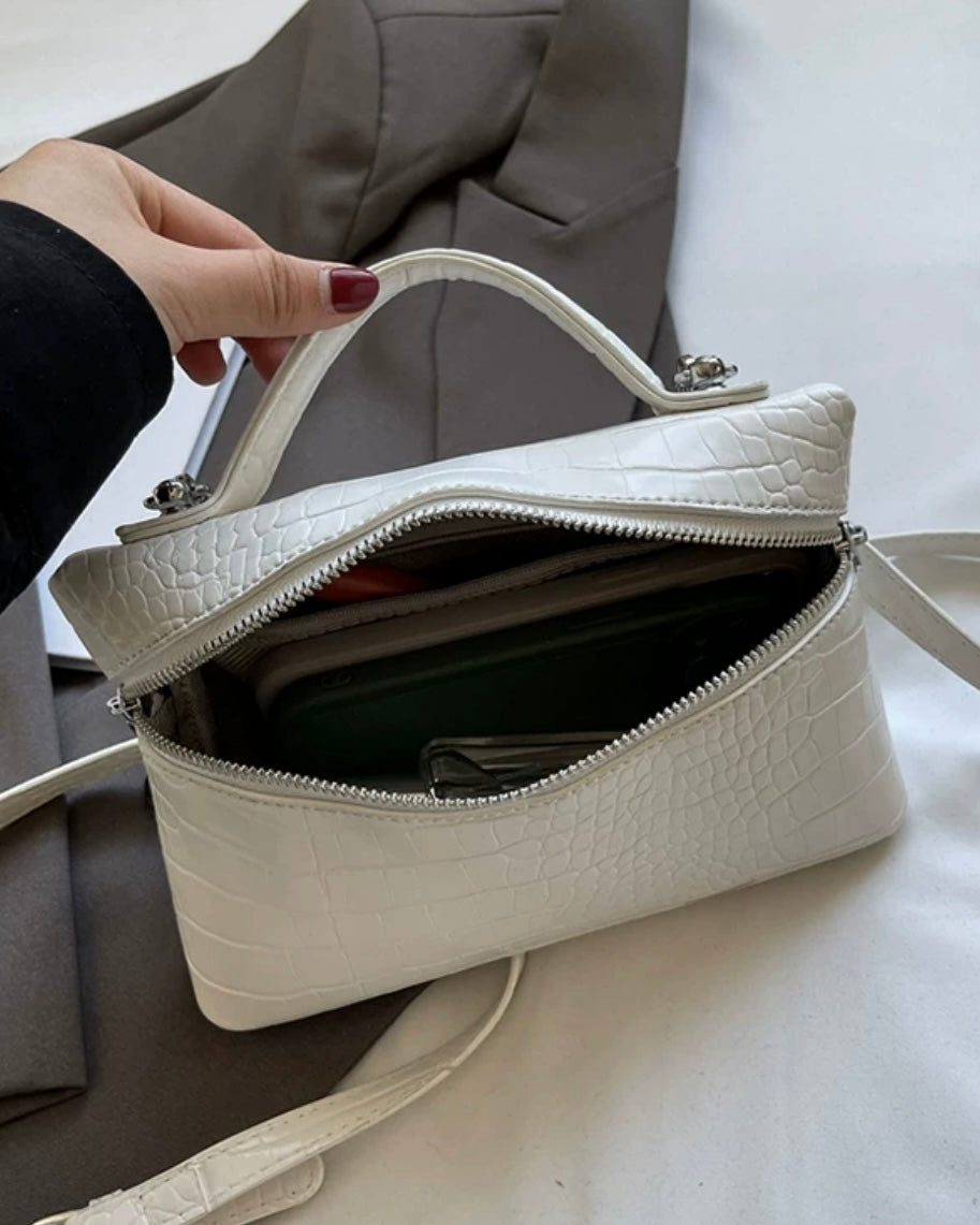 共地のクロコ型押しショルダーベルトが女性らしく上品な印象に。カジュアルも綺麗めコーデにもぴったりなデザイン。