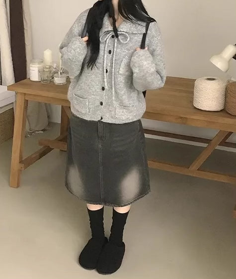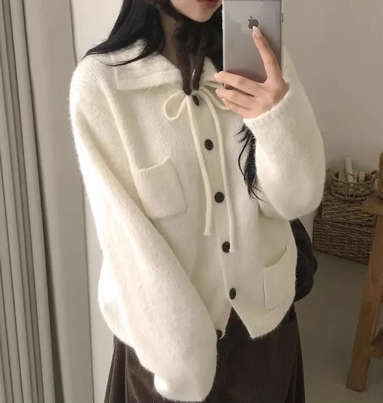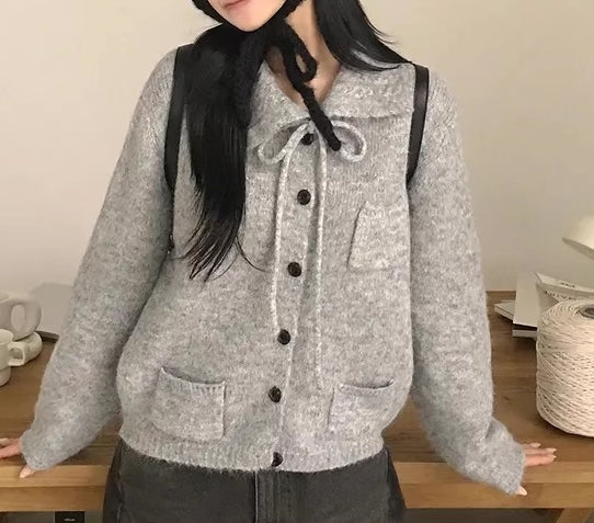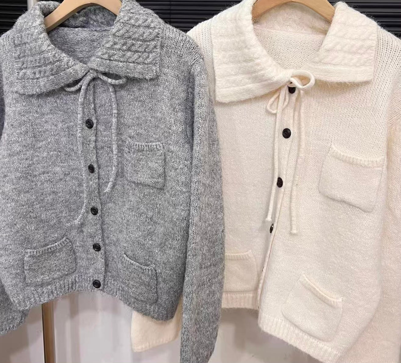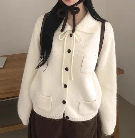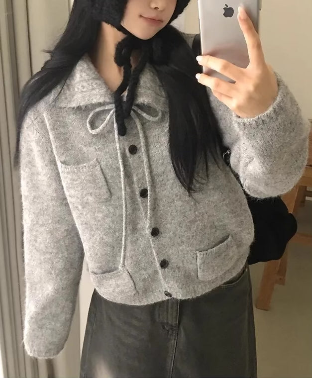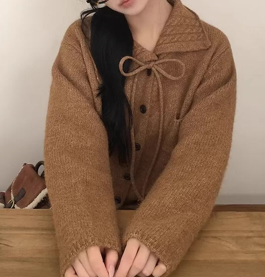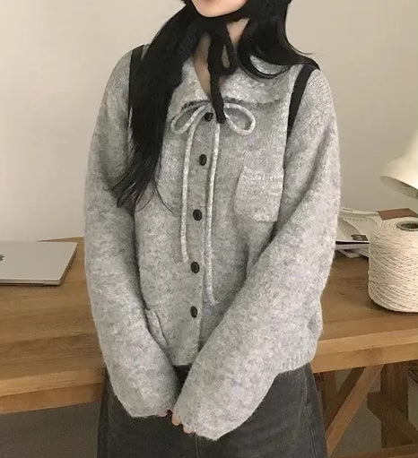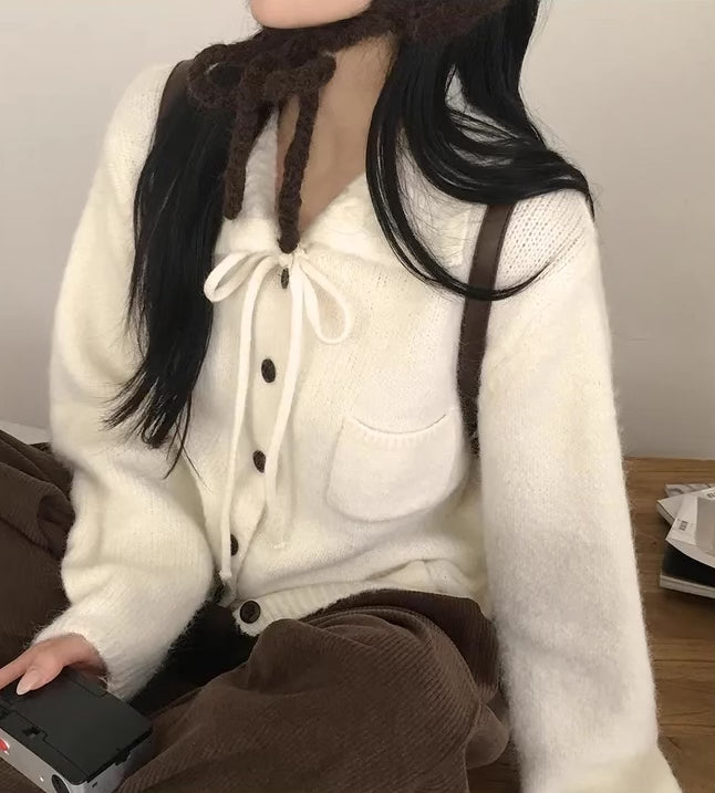 顔周りを華やかに演出してくれるリボンカーディガン。