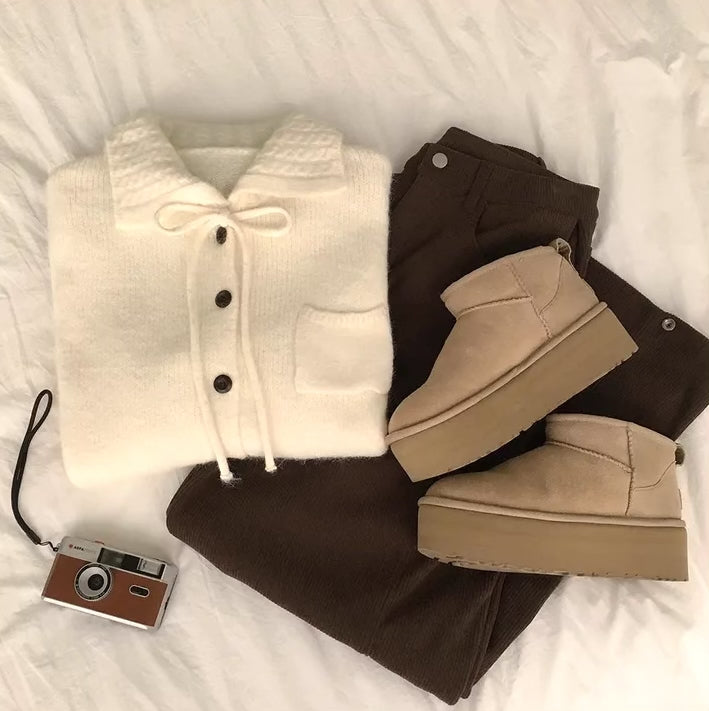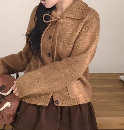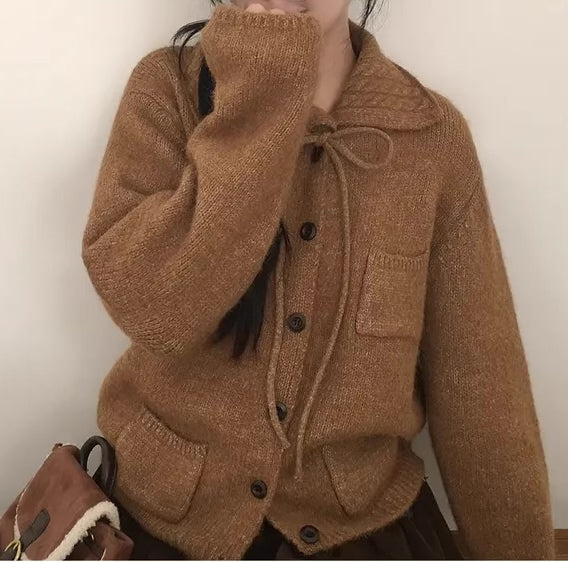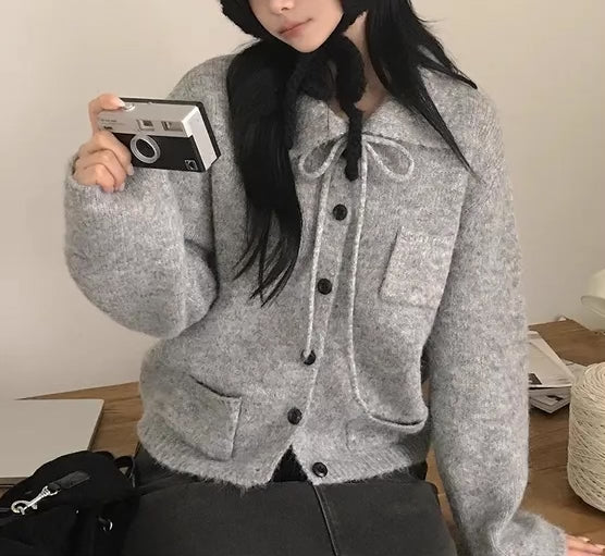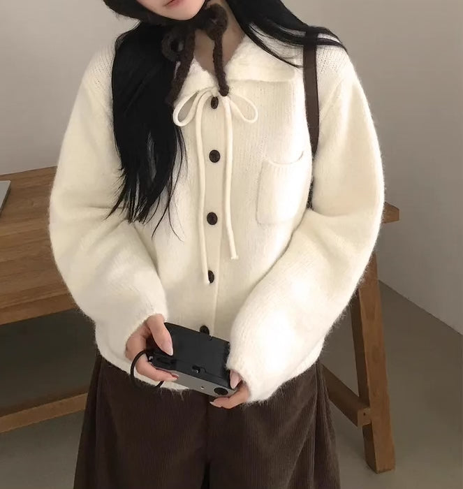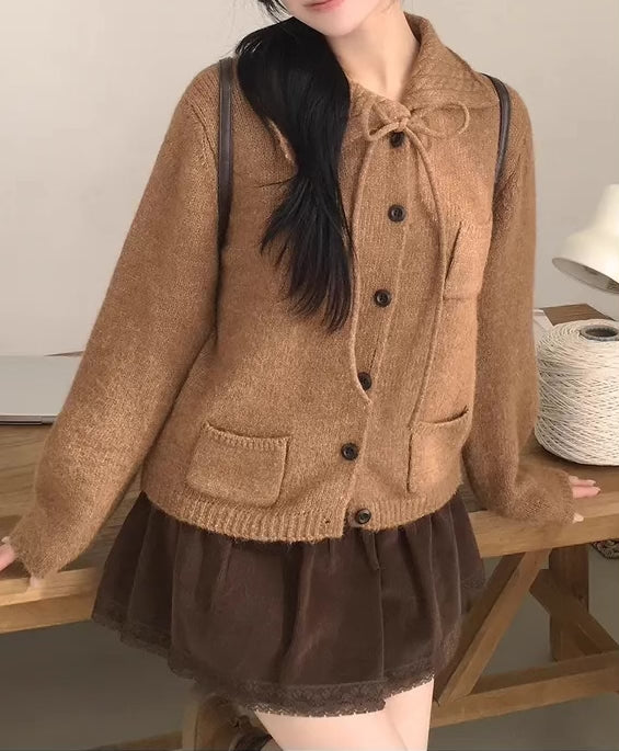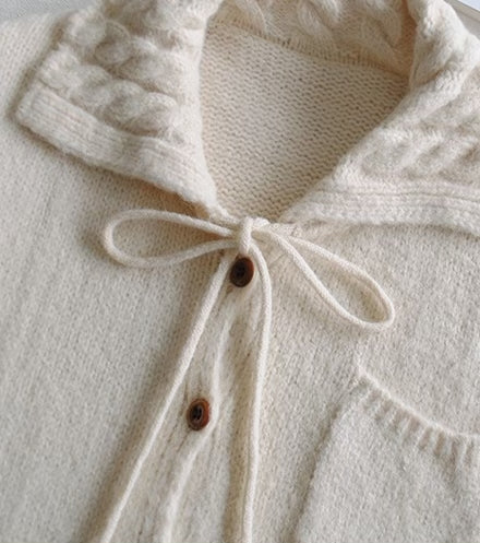 顔周りを華やかに演出してくれるリボンカーディガン。