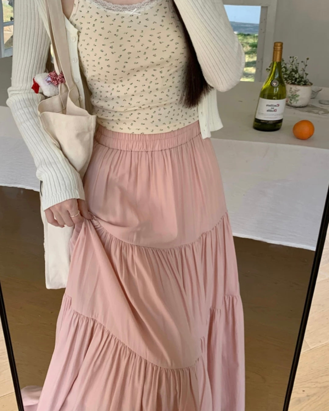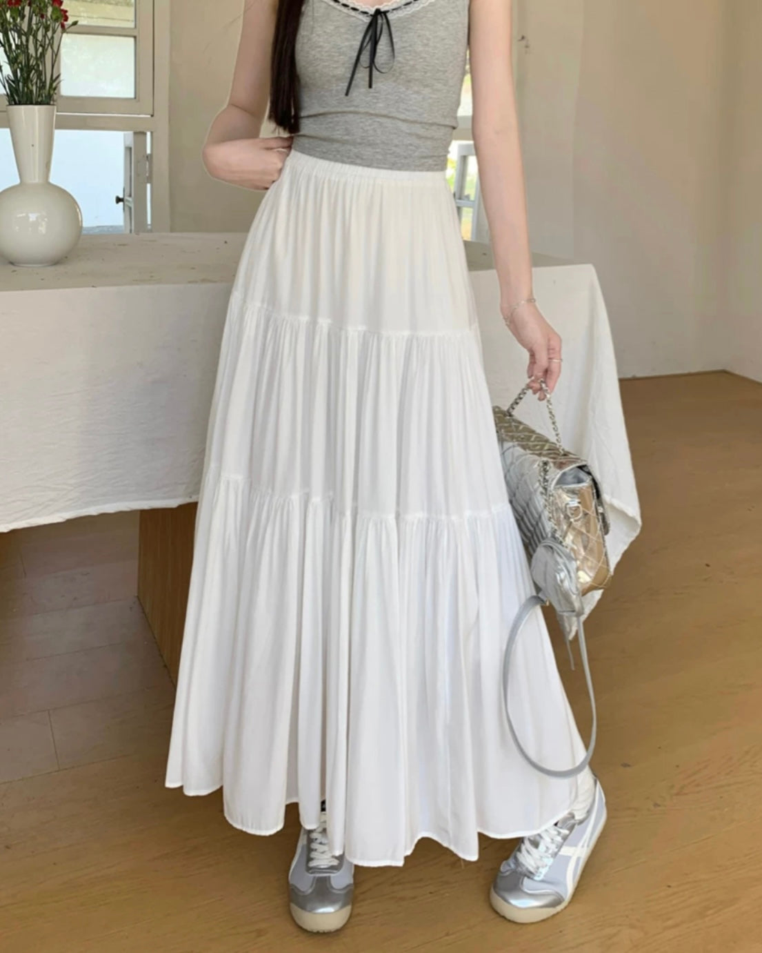 横に広がりすぎない下に伸びるシルエットなので、ギャザースカートが得意でない方にもおすすめ。シルエットもすっきり着こなせます。