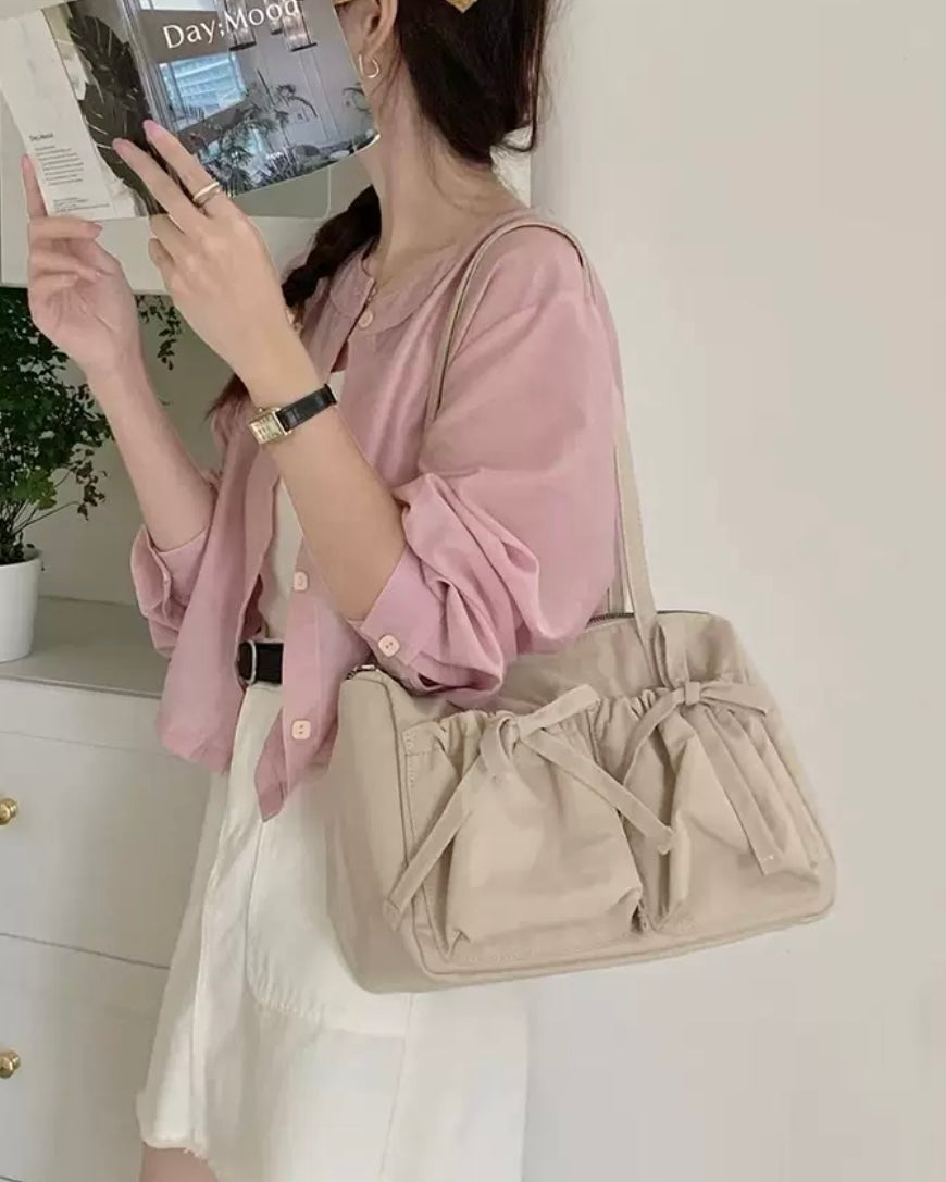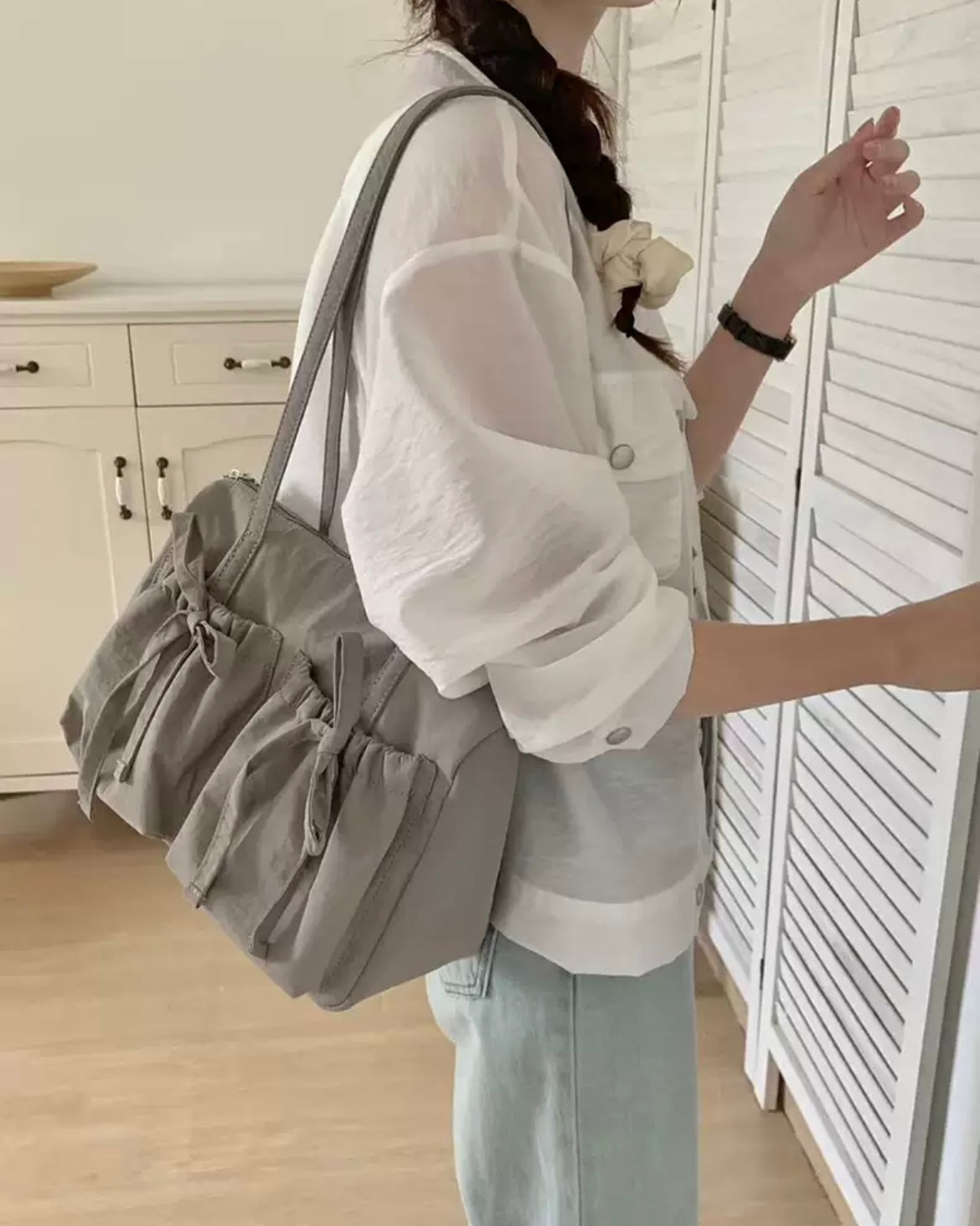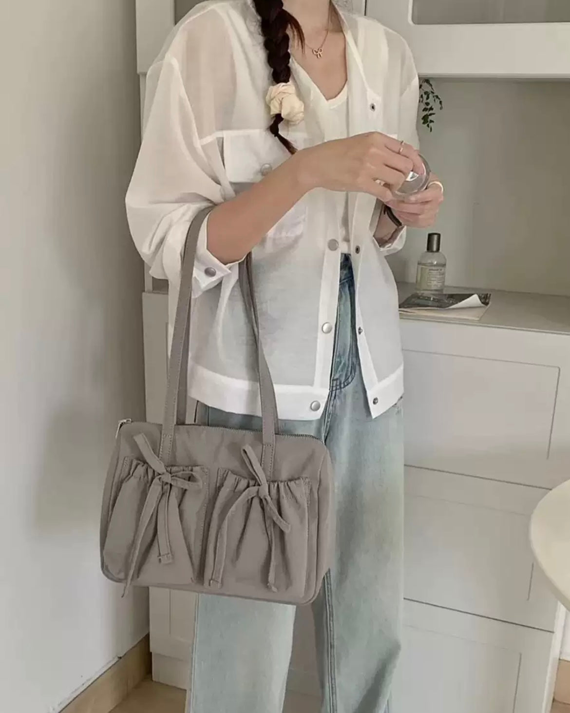 カジュアルにもガーリーにも合わせやすいトートバッグ。