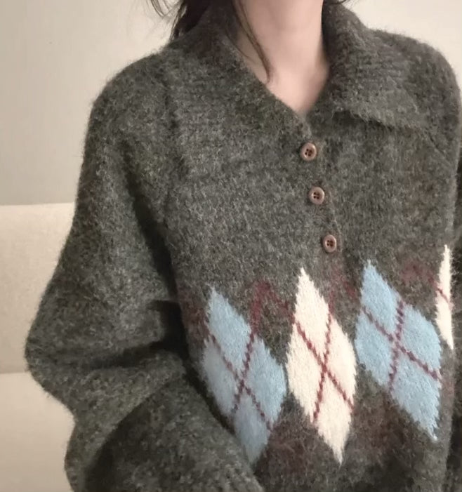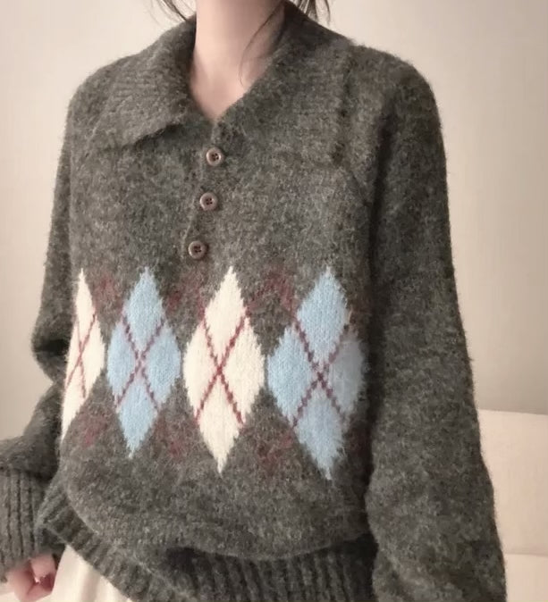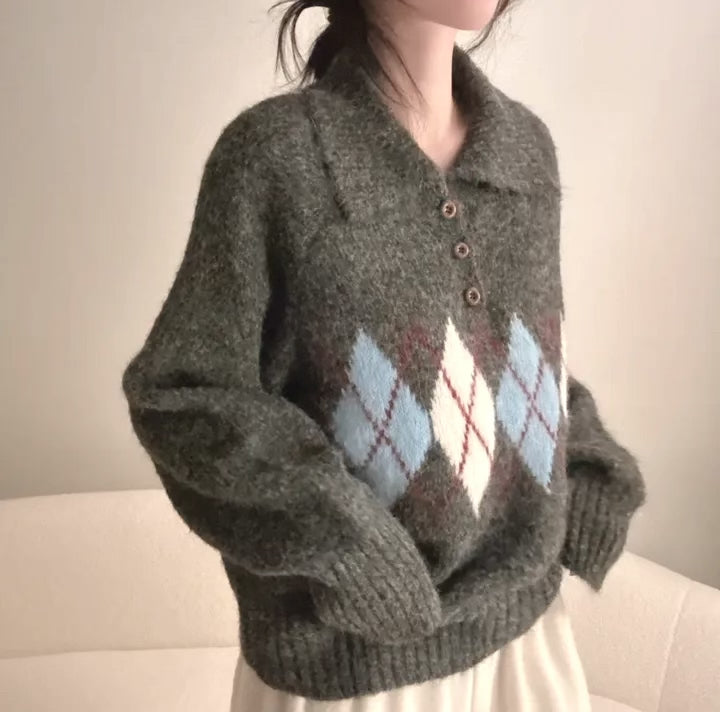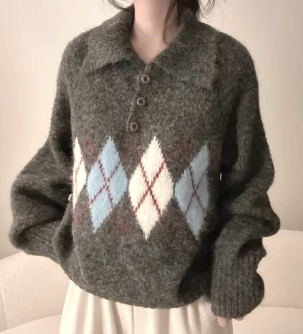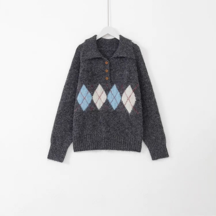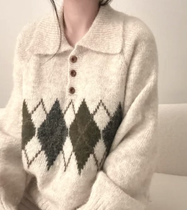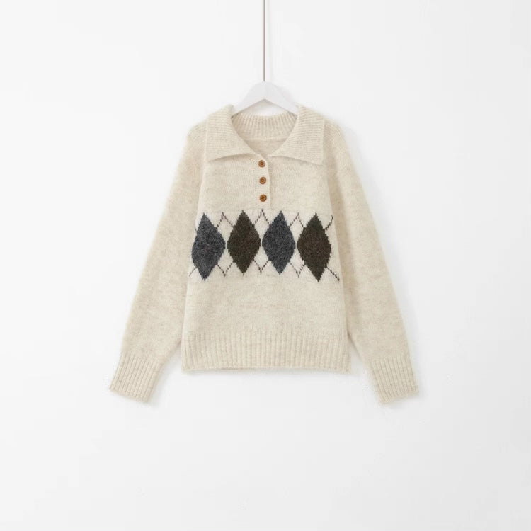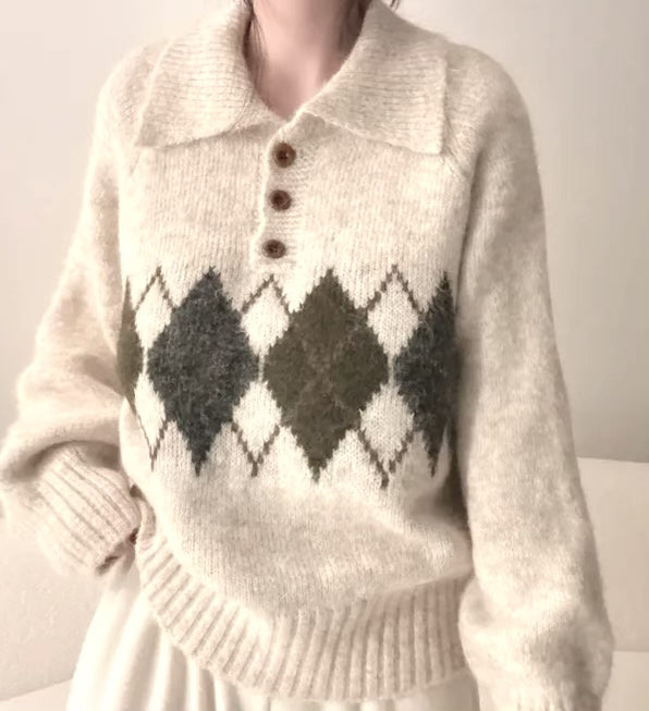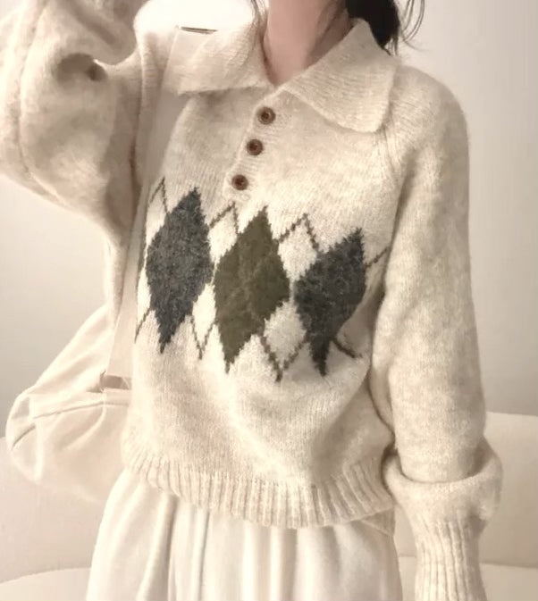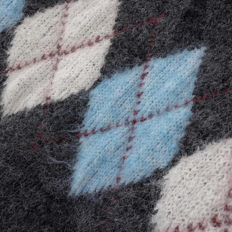 秋冬ムードを高めてくれる、クラシカルなアーガイル柄のニット。