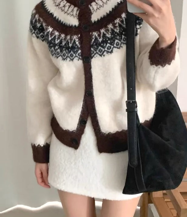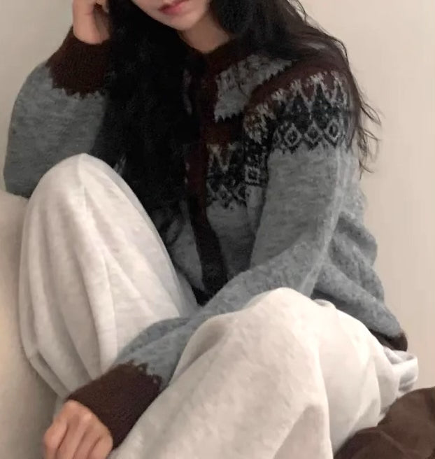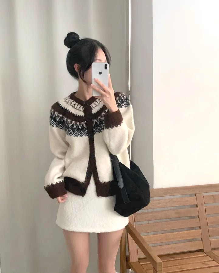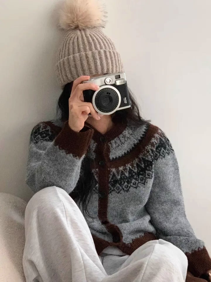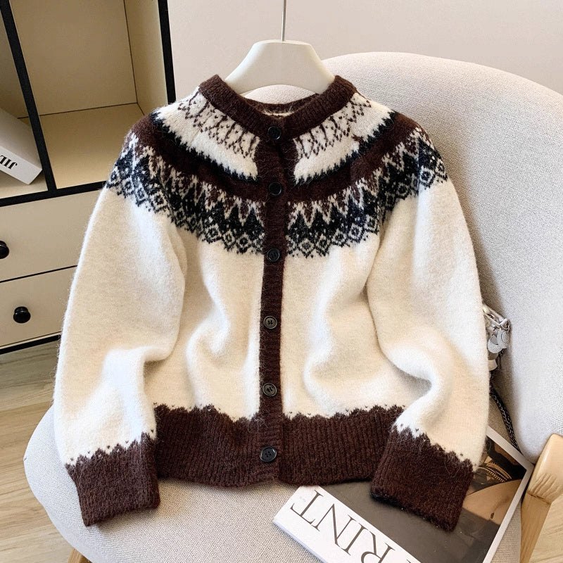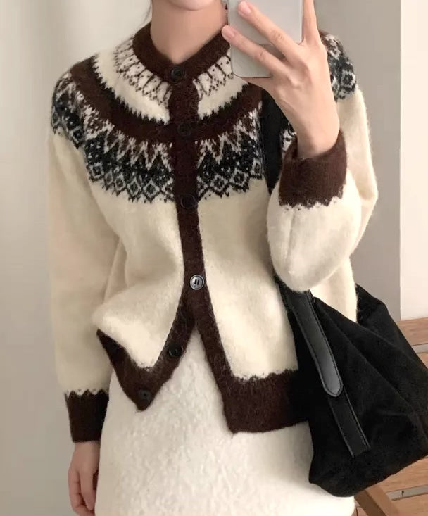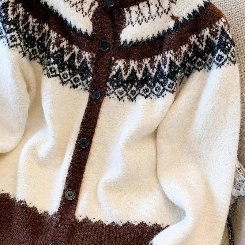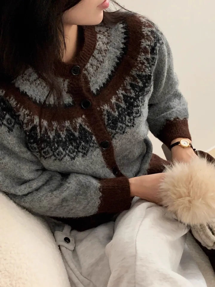 落ち着いたシックなカラーリングでクラシカルな雰囲気が素敵なノルディック柄カーディガン。