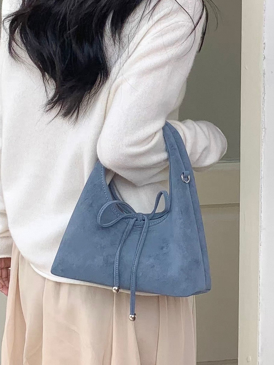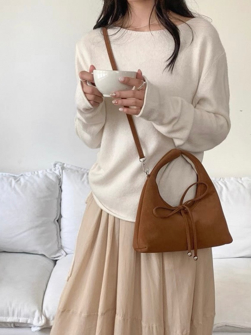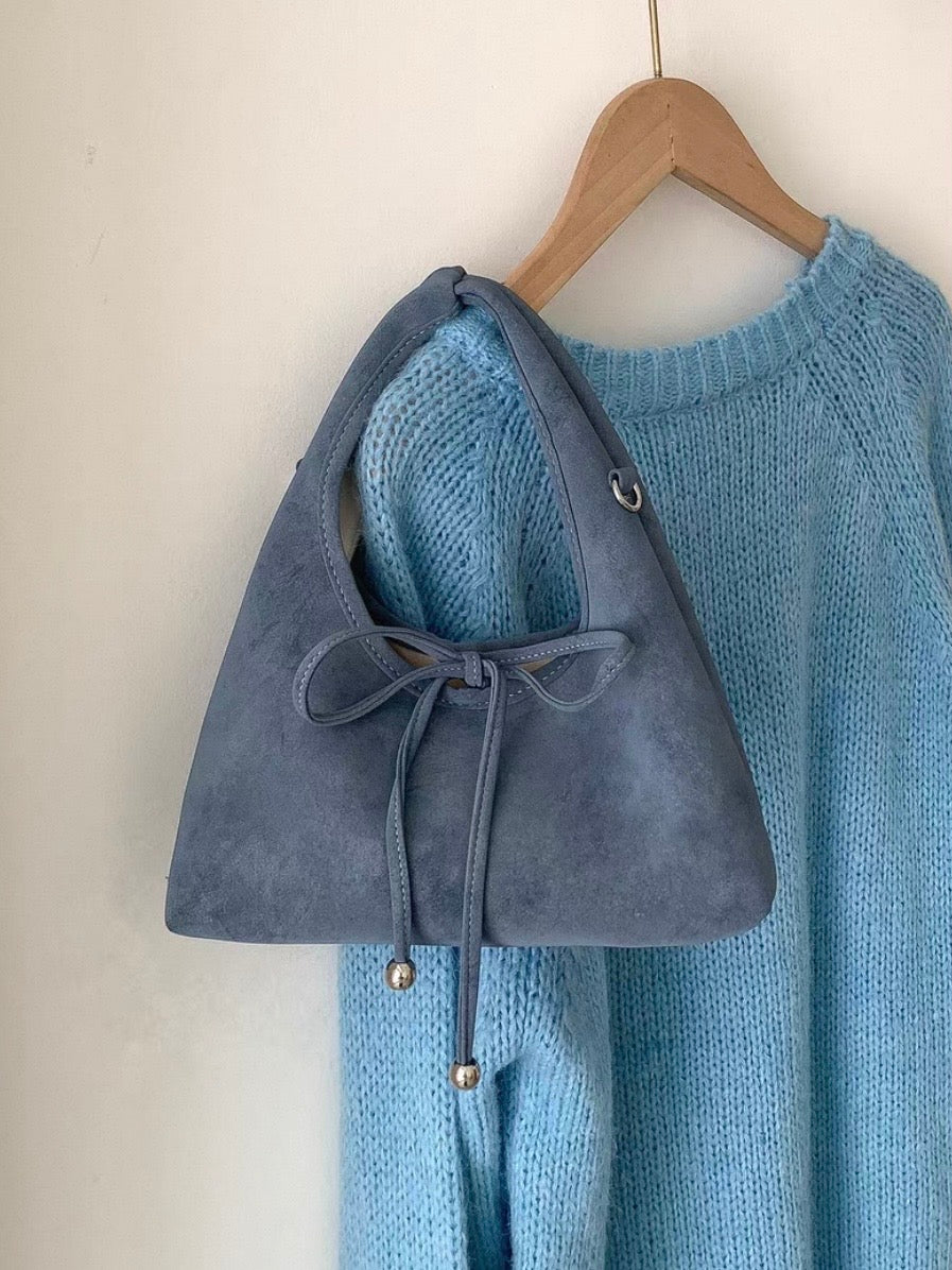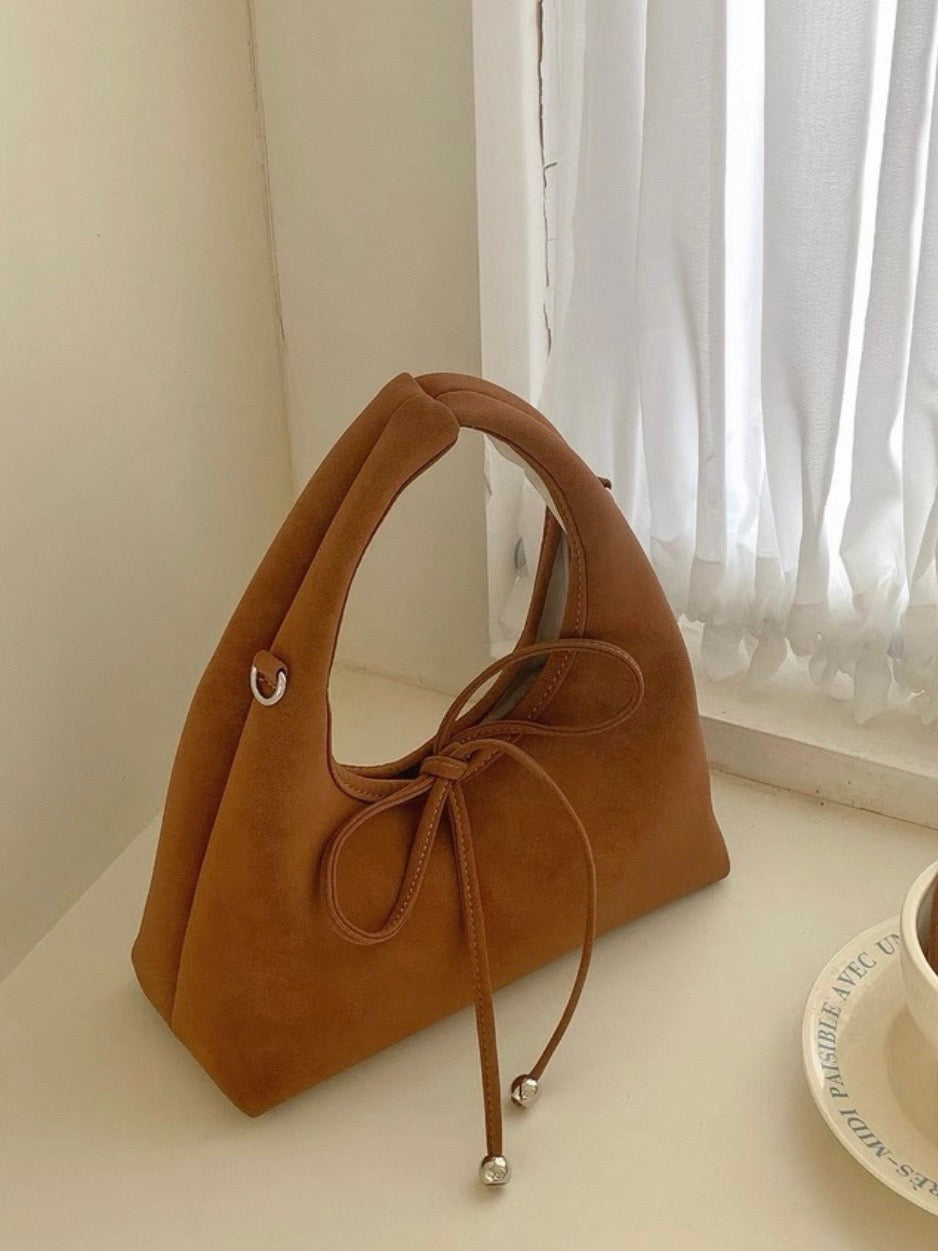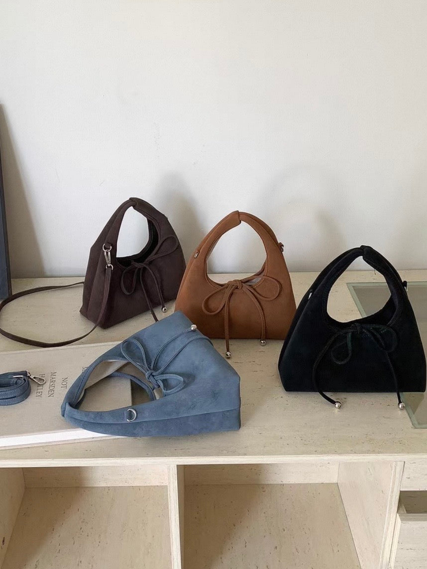 スエード調の素材と丸っとしたデザインが柔らかい印象を与え、共地のリボンが可愛らしく演出。