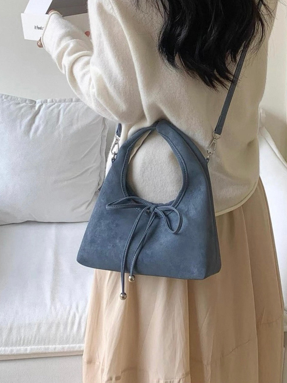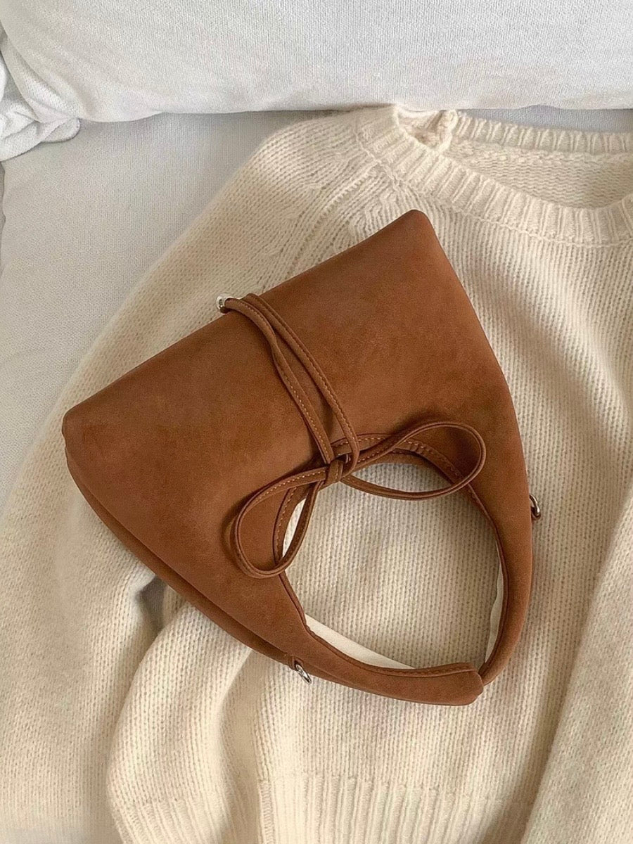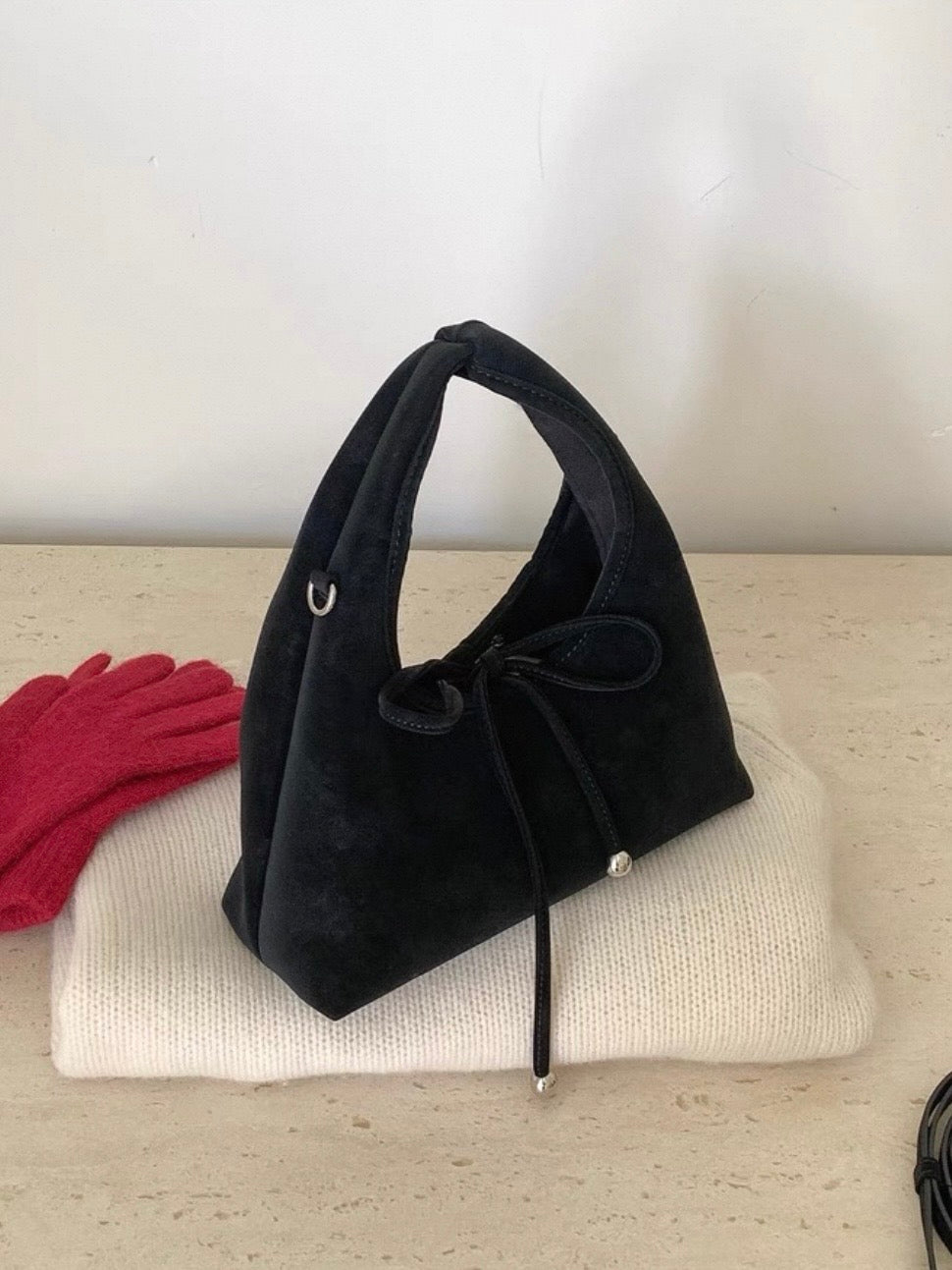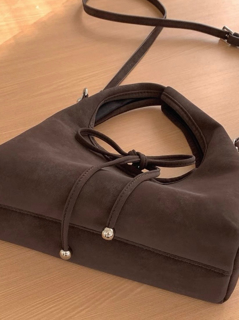 スエード調の素材と丸っとしたデザインが柔らかい印象を与え、共地のリボンが可愛らしく演出。