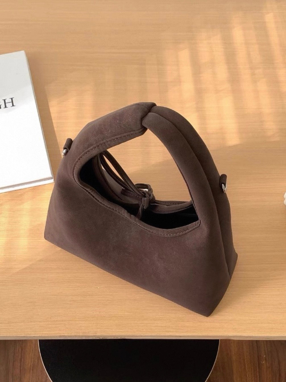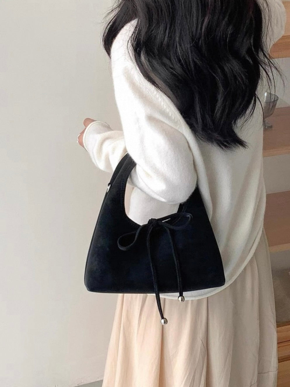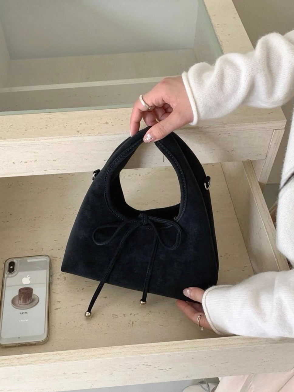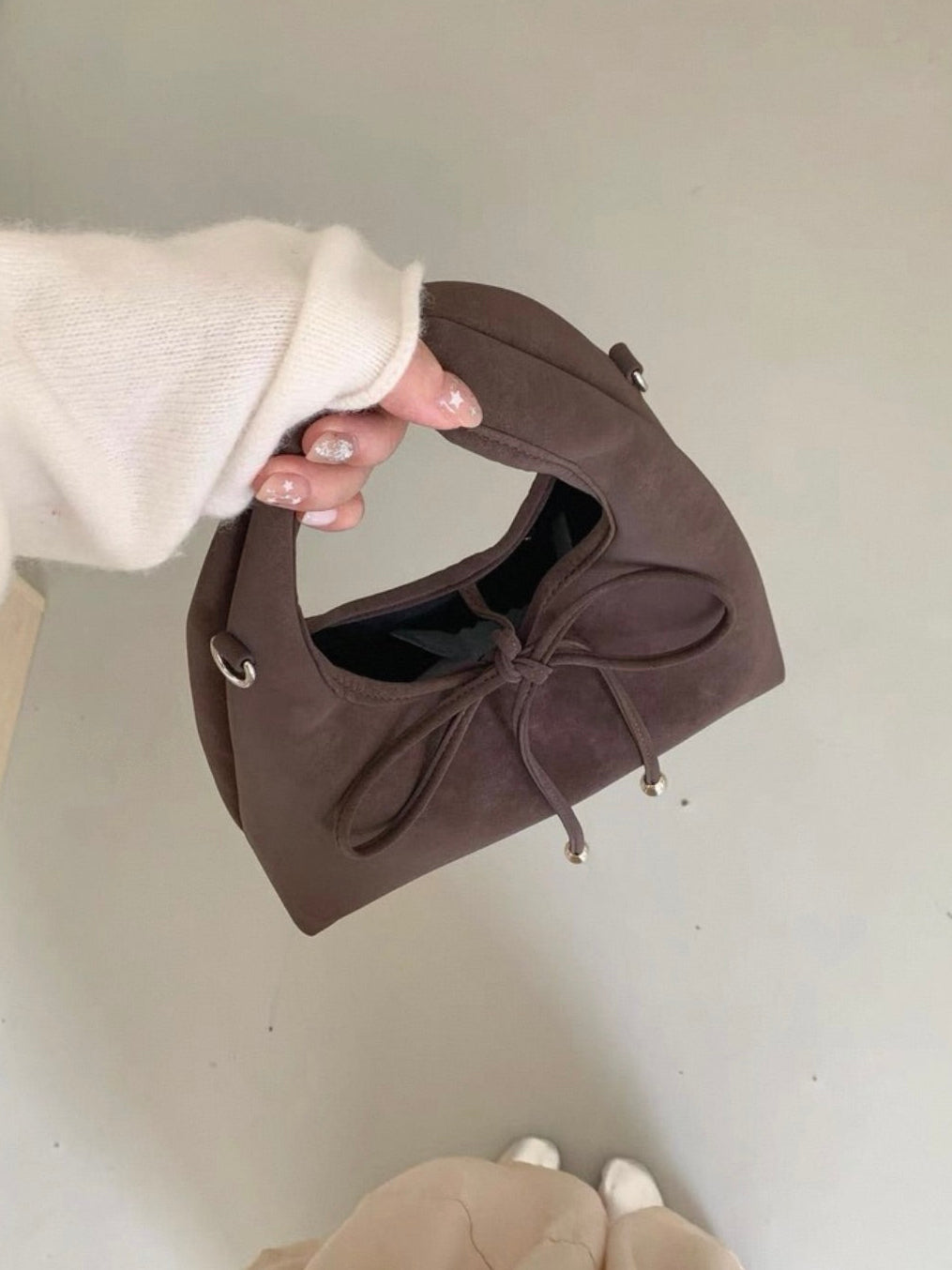 スエード調の素材と丸っとしたデザインが柔らかい印象を与え、共地のリボンが可愛らしく演出。
