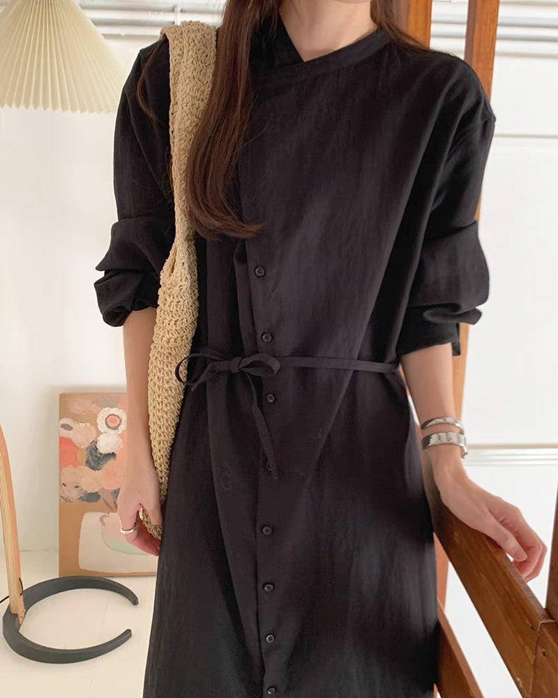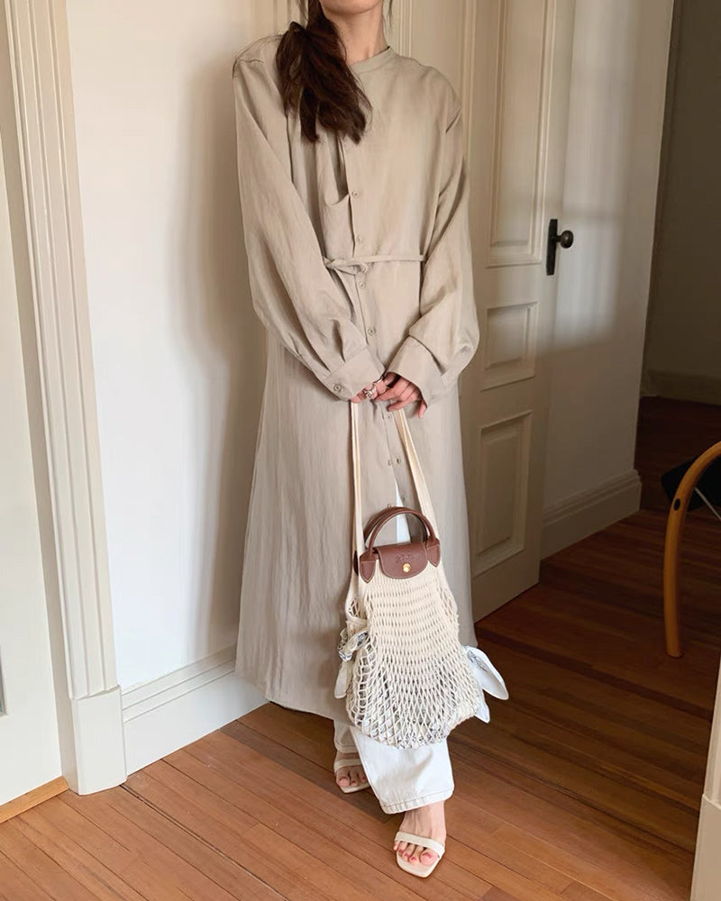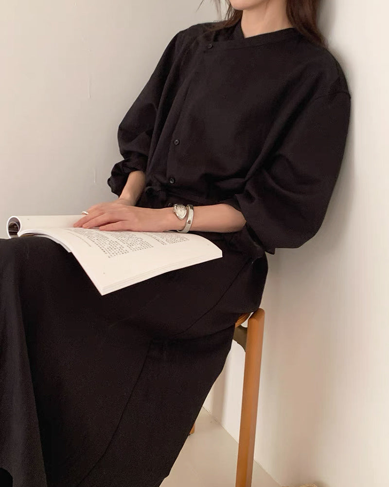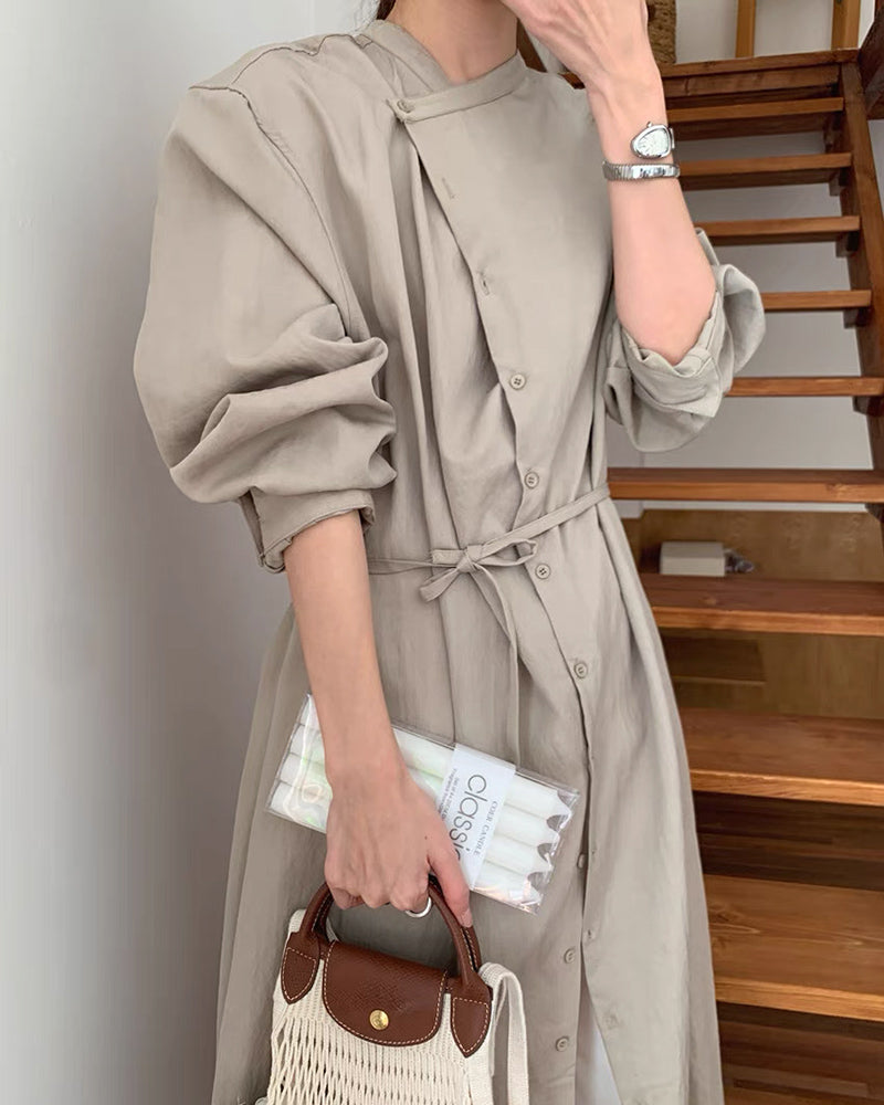 共紐のリボンでウエストマークするとメリハリのあるシルエットに。