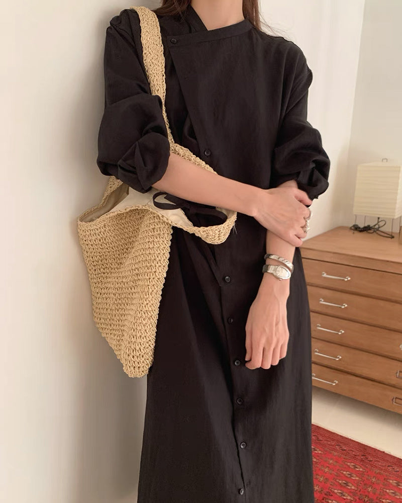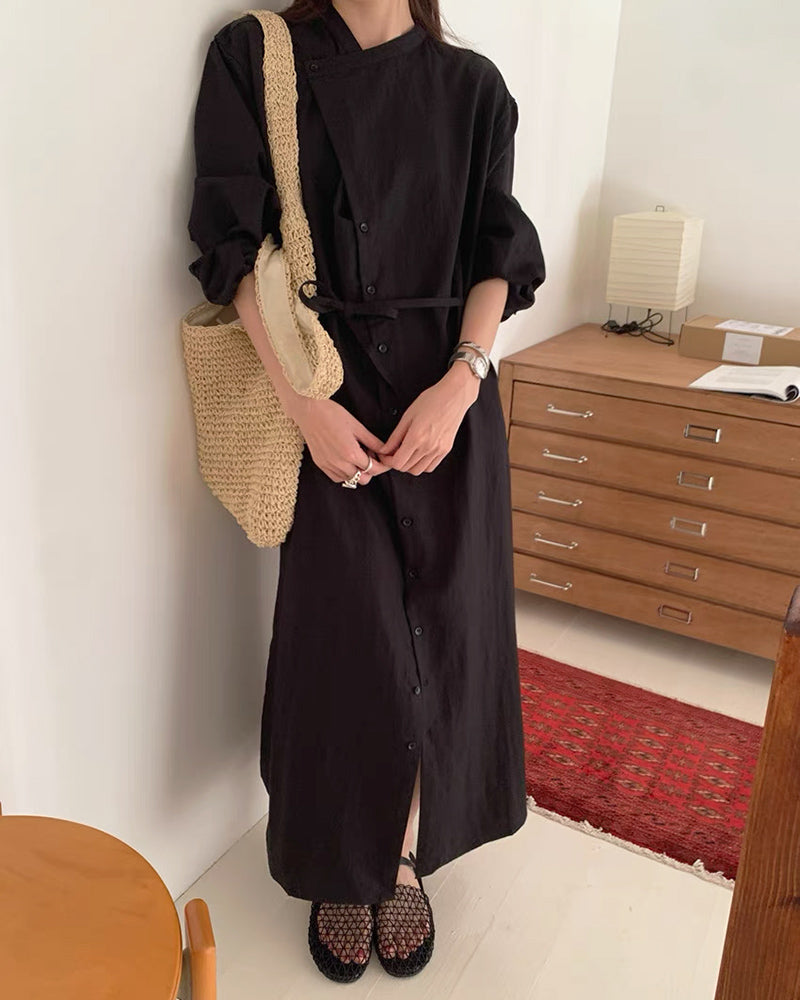 斜めのアシメデザインがポイントのワンピース。着るだけでこなれ感ある着こなしに◎