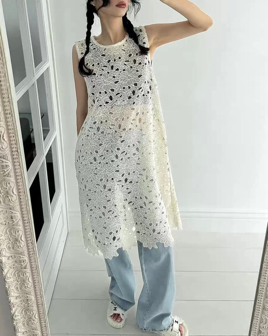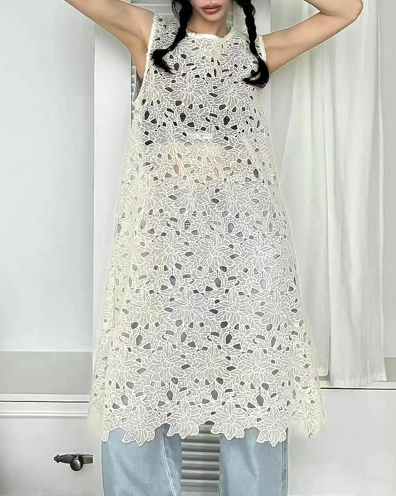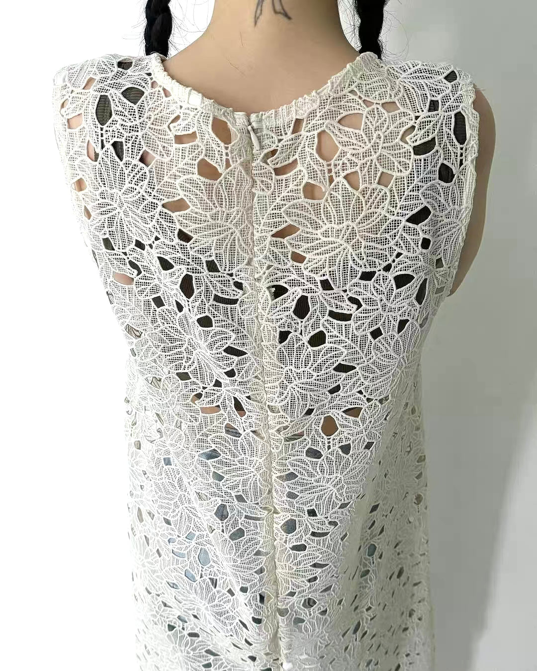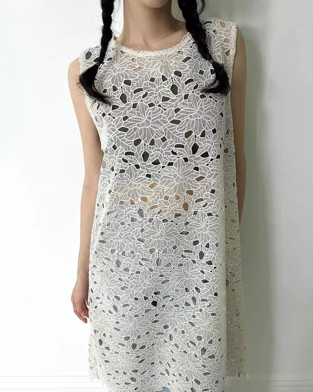 フラワーモチーフのレースがレディライクで素敵なノースリーブワンピース。