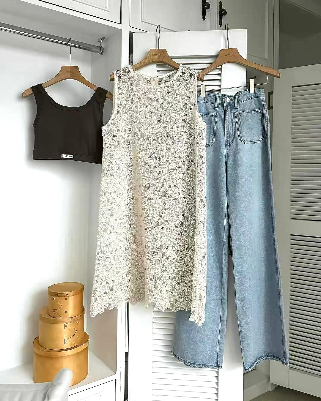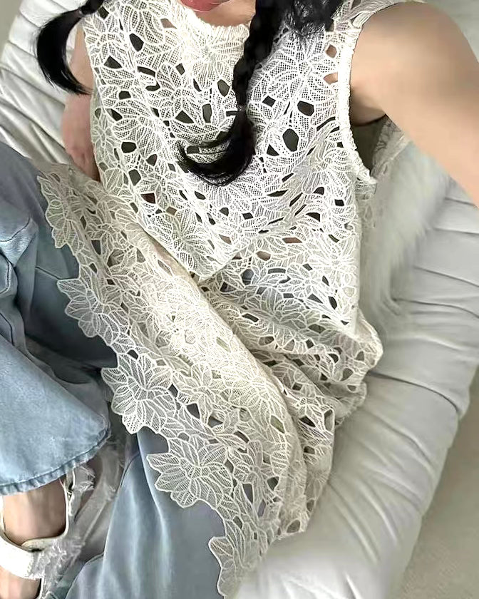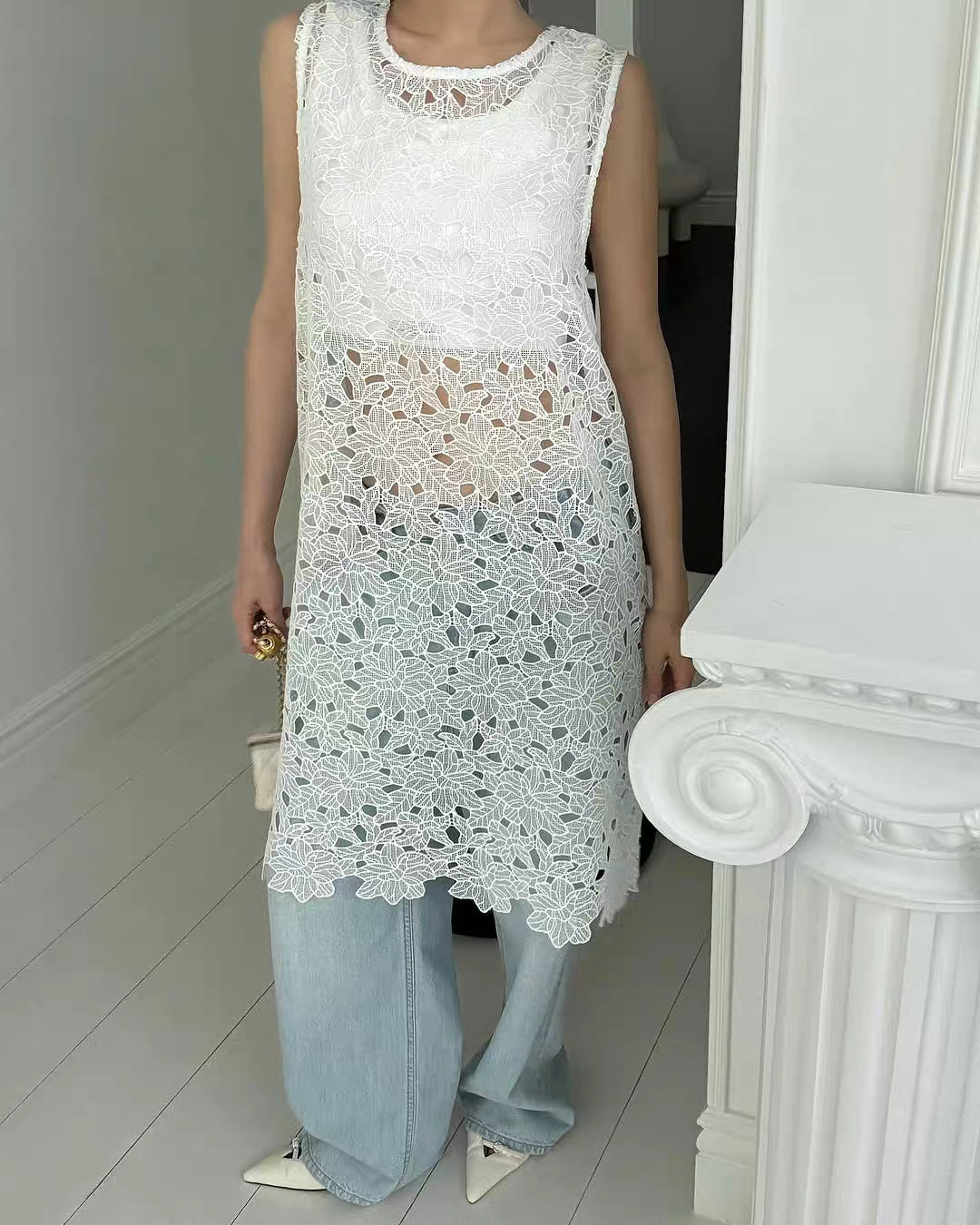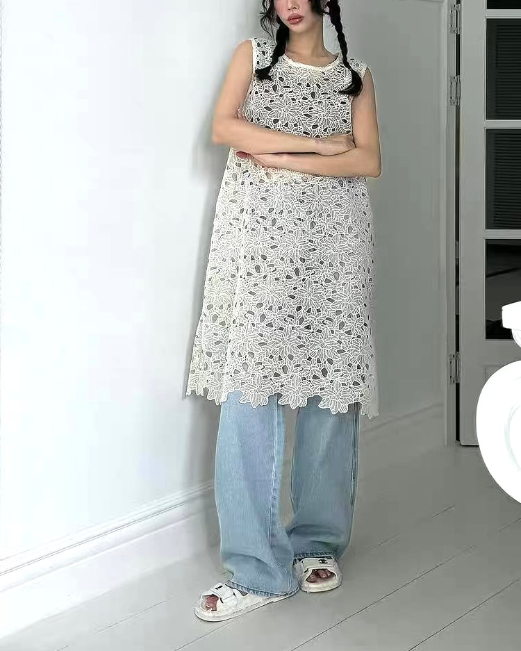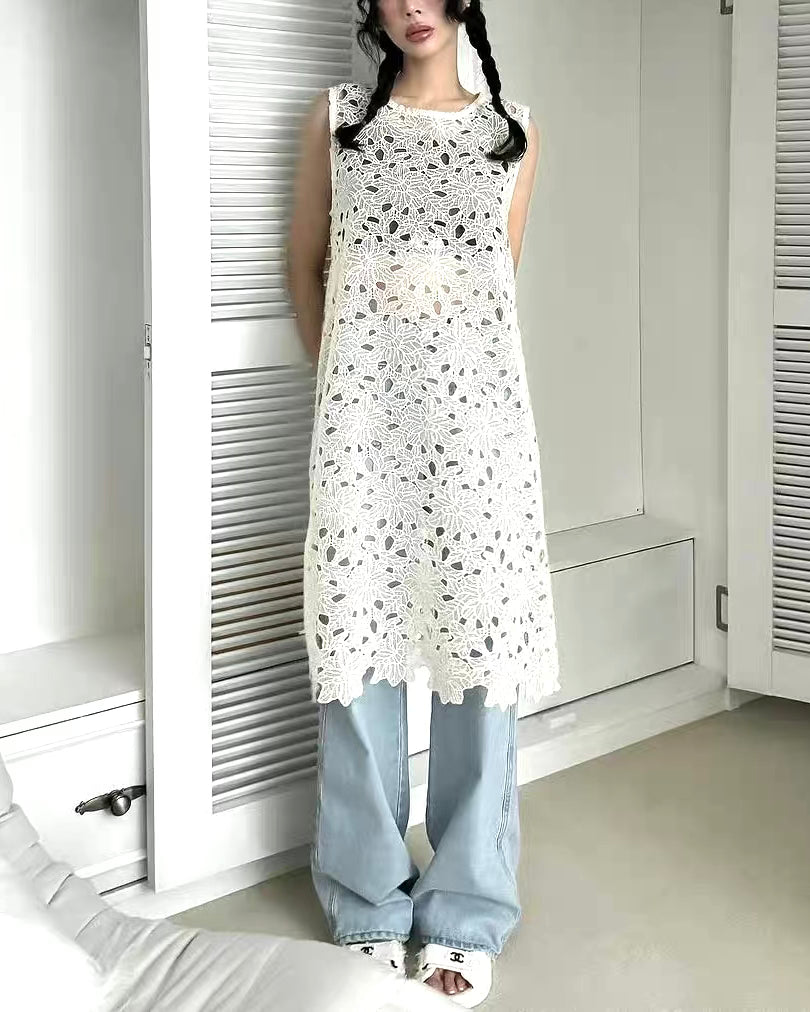 フラワーモチーフのレースがレディライクで素敵なノースリーブワンピース。