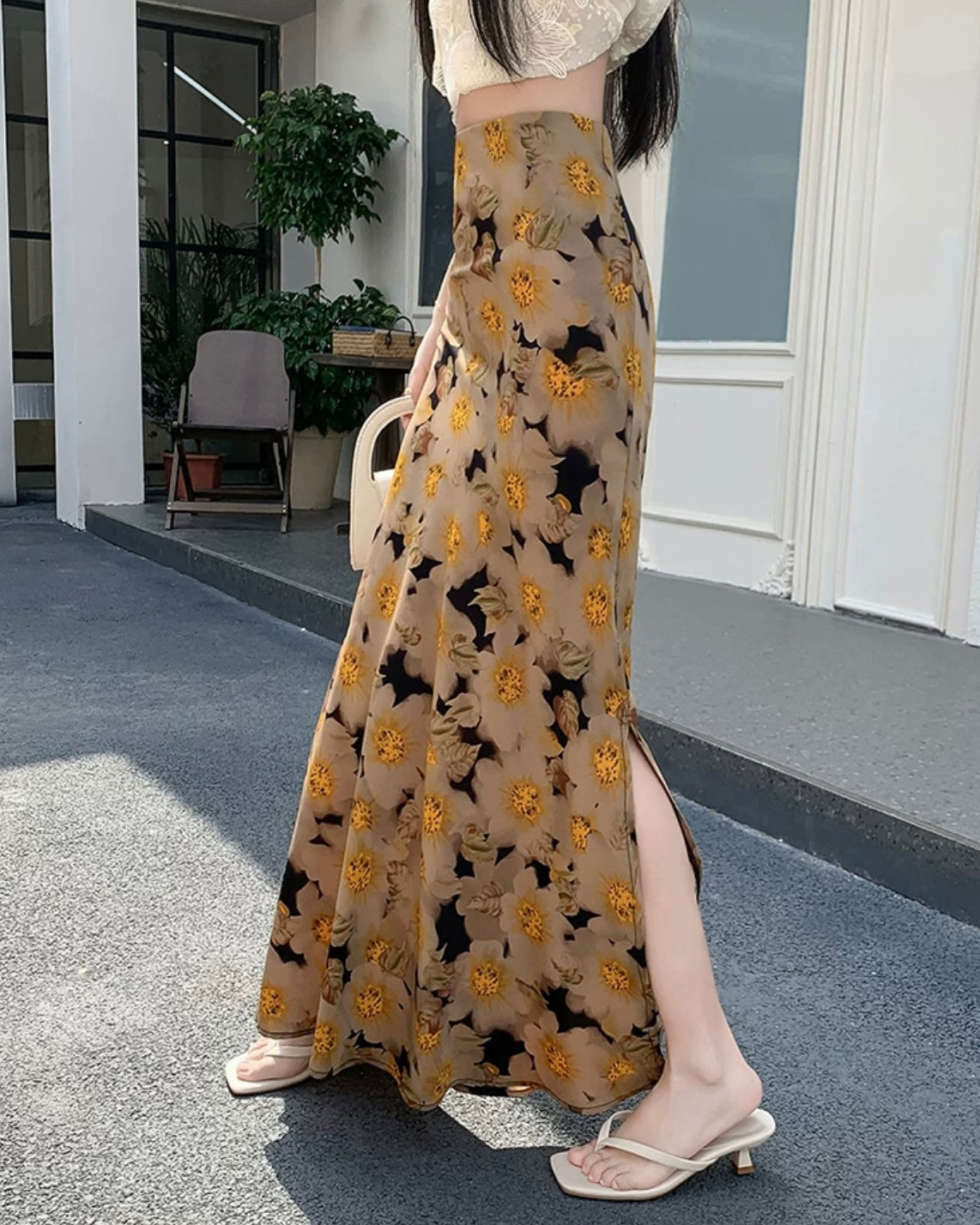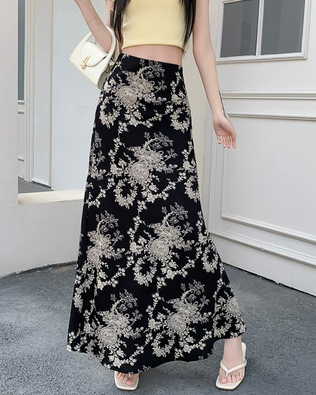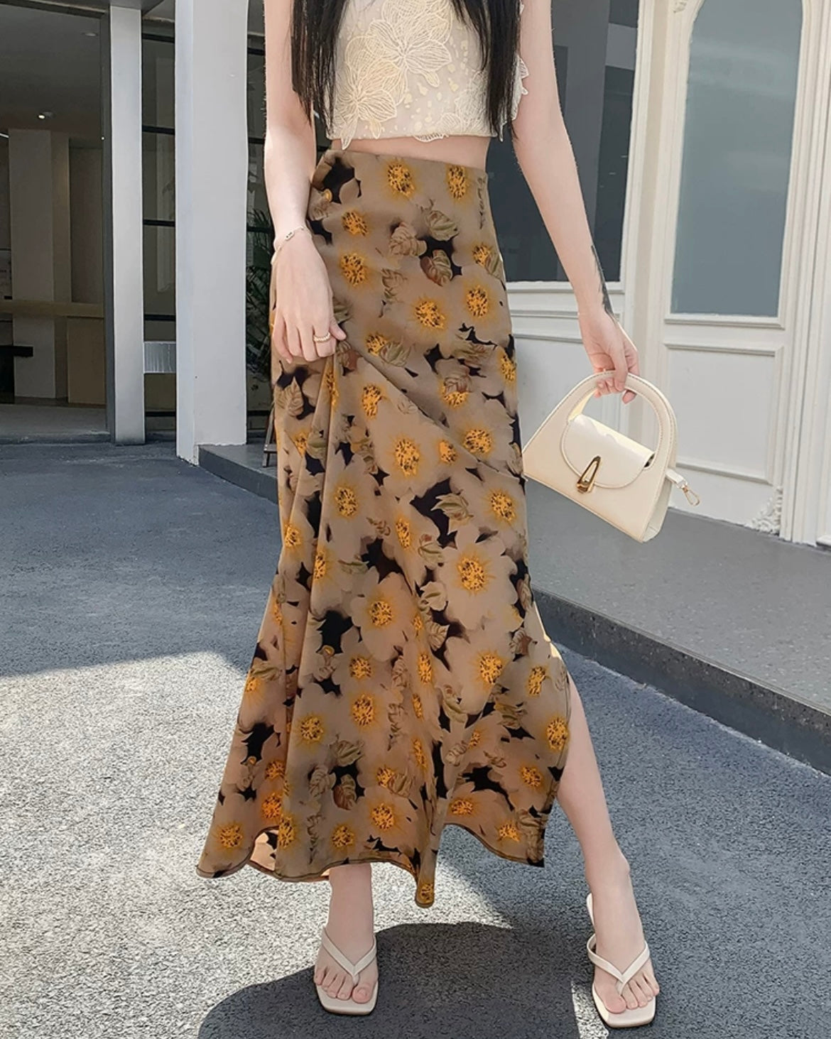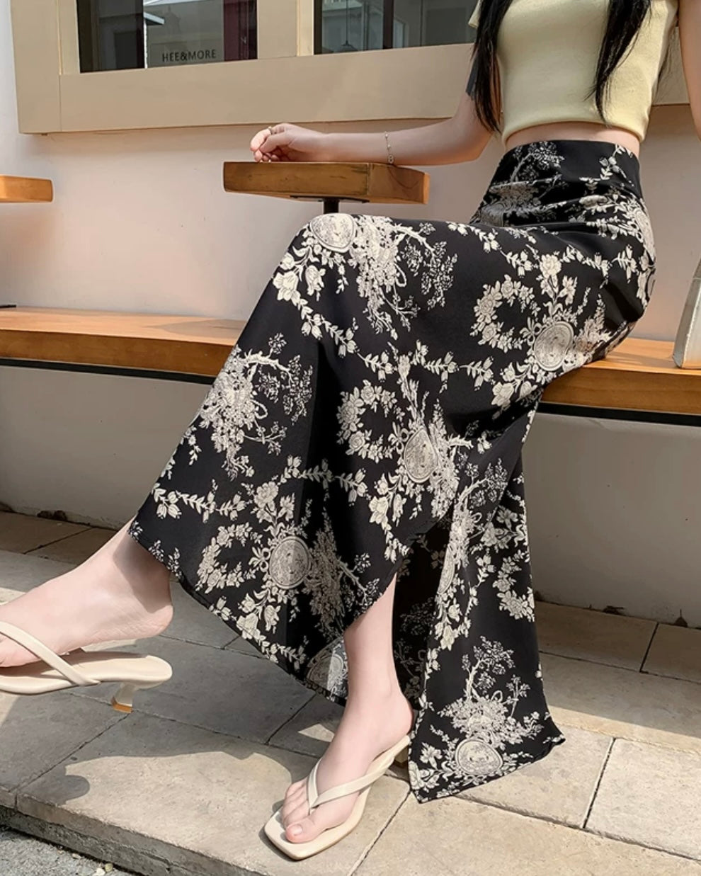 ハイウエストデザインでスタイルアップも叶えつつ、大柄が華やかで目を惹くデザイン。