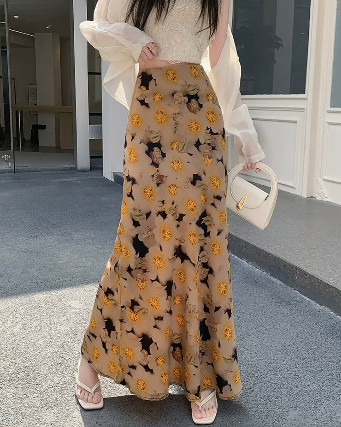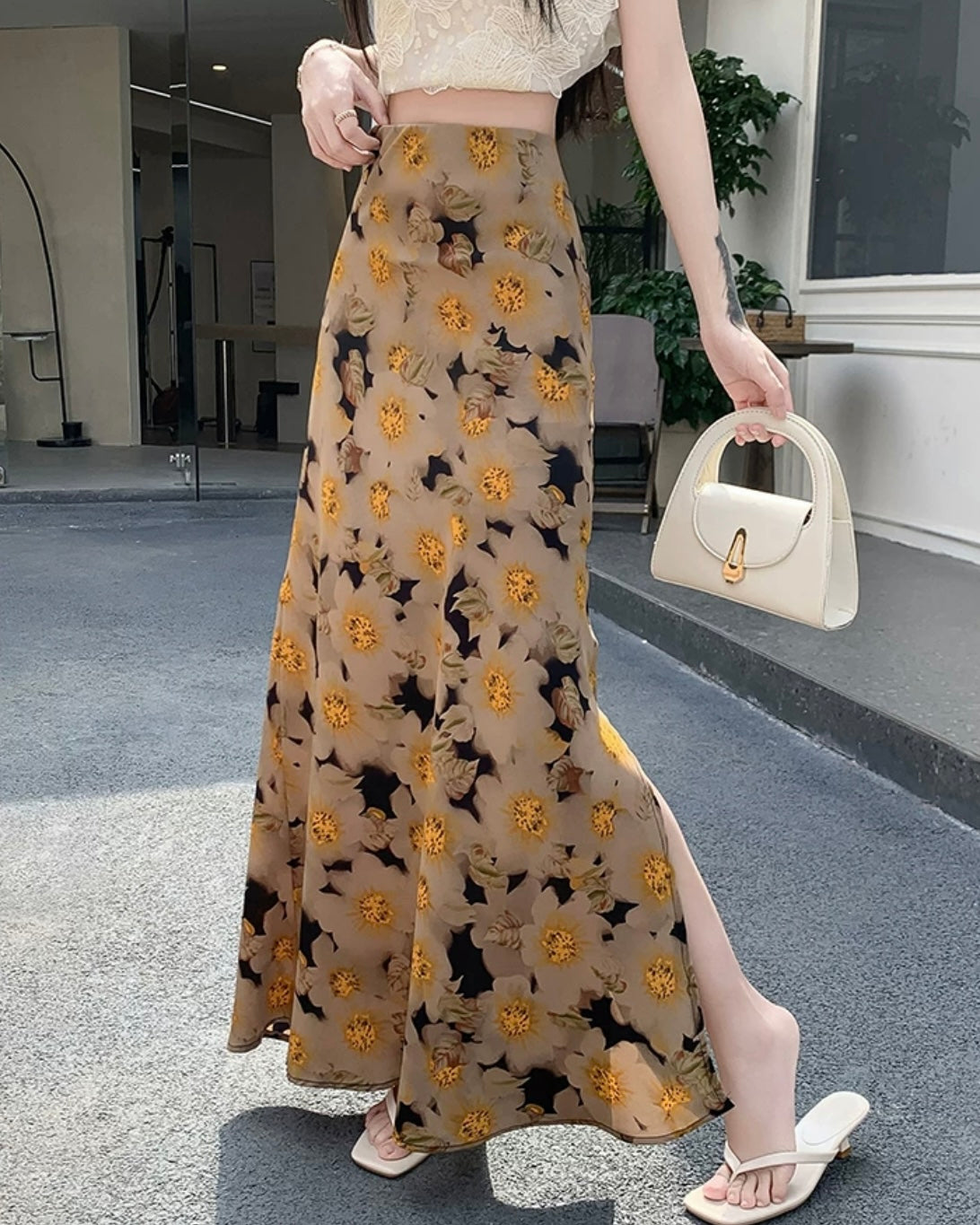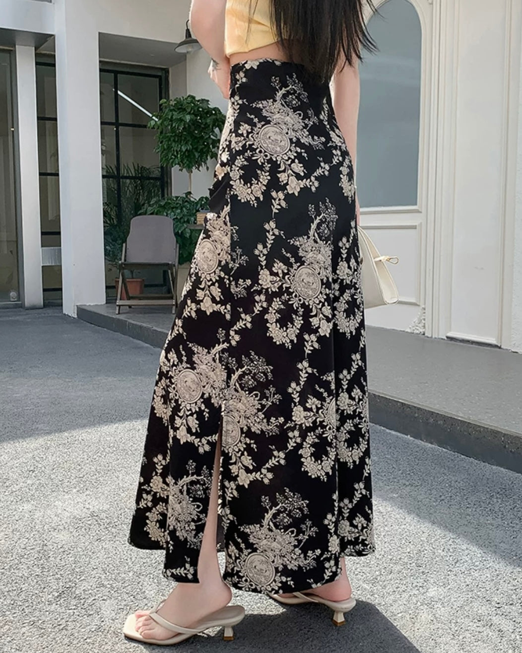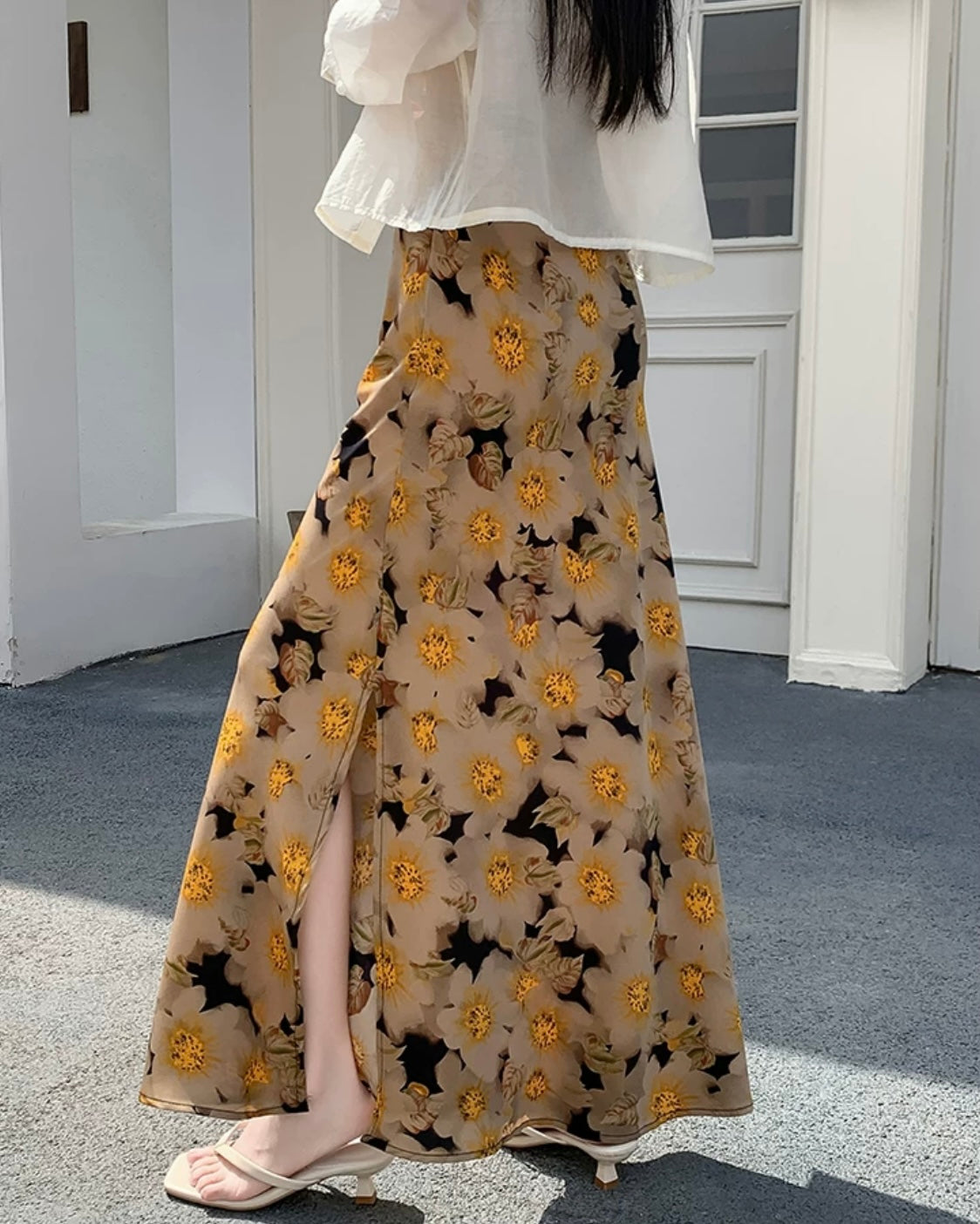 ハイウエストデザインでスタイルアップも叶えつつ、大柄が華やかで目を惹くデザイン。
