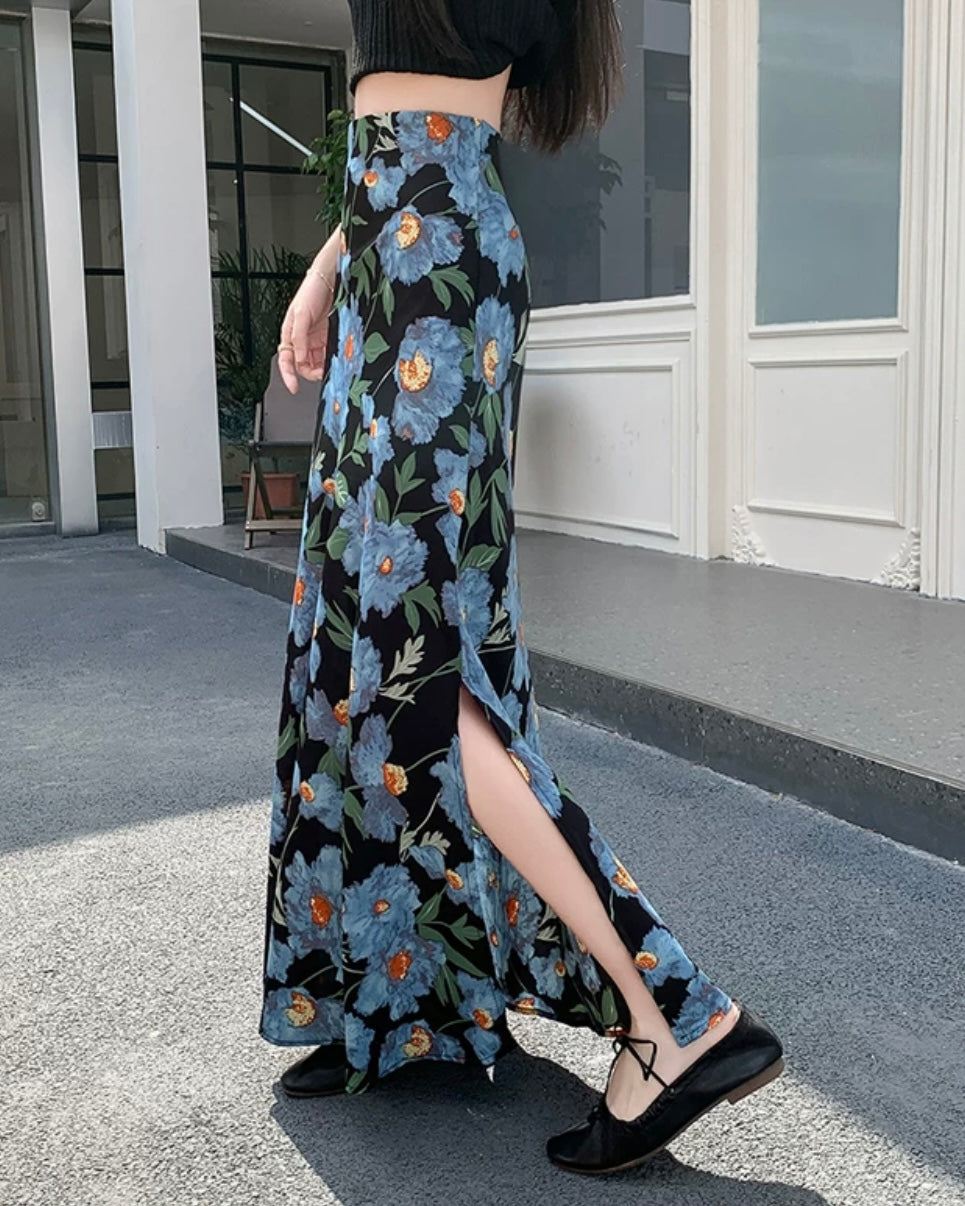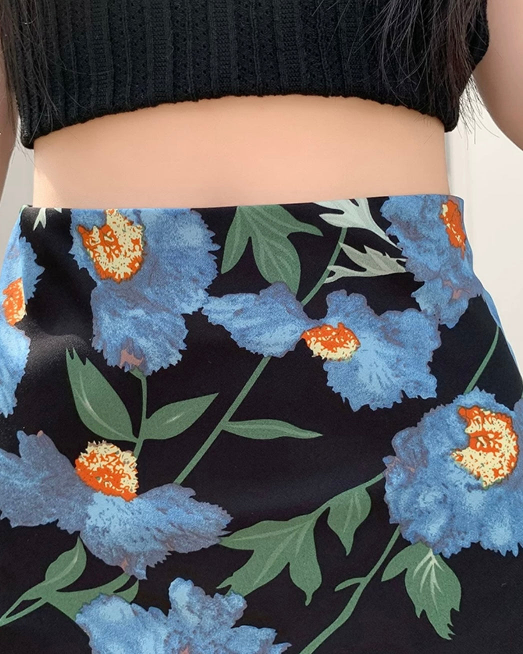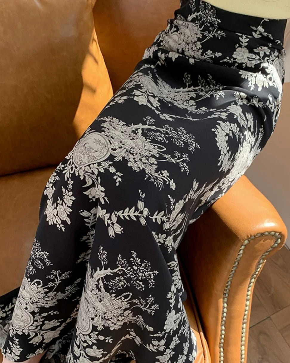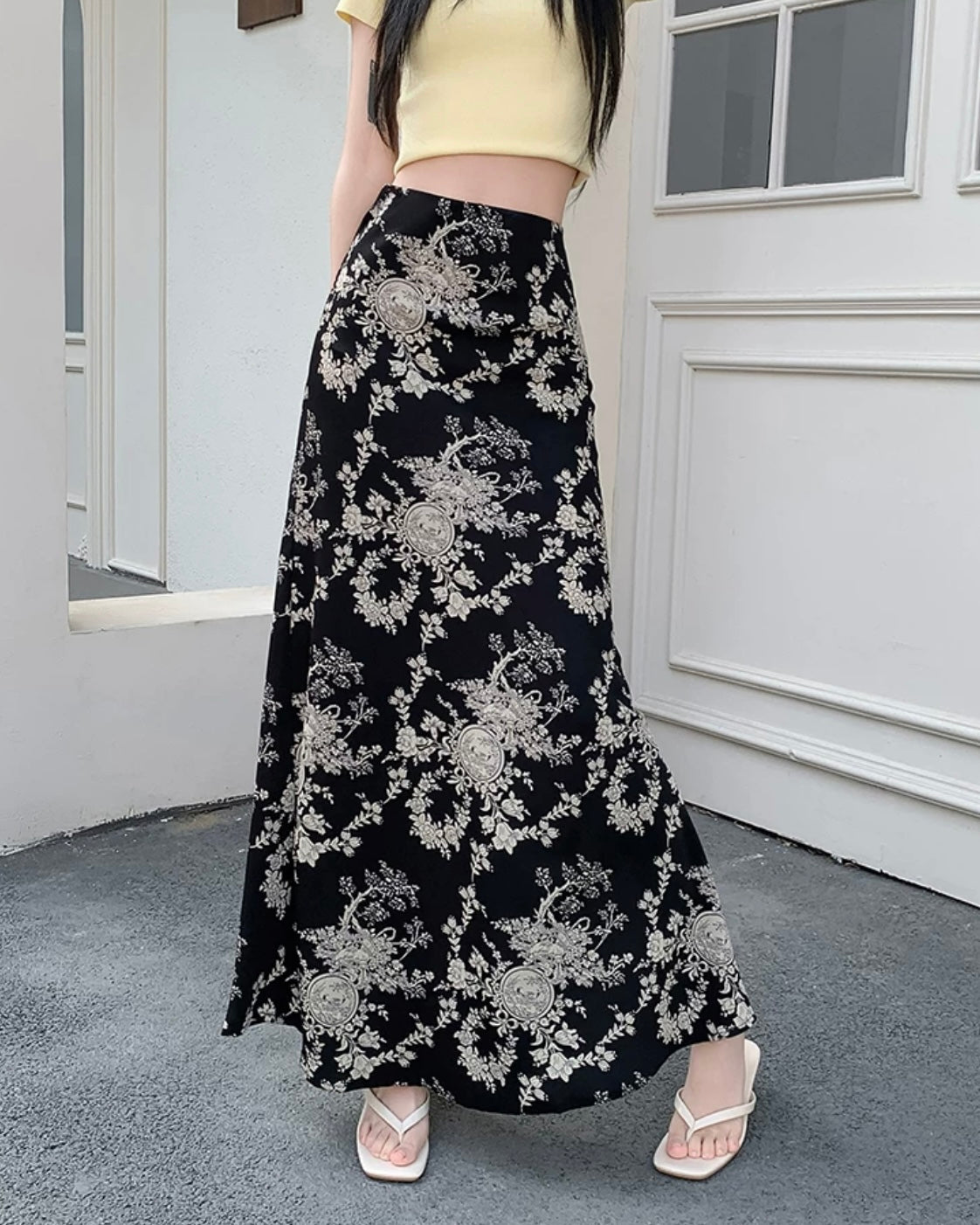 ハイウエストデザインでスタイルアップも叶えつつ、大柄が華やかで目を惹くデザイン。