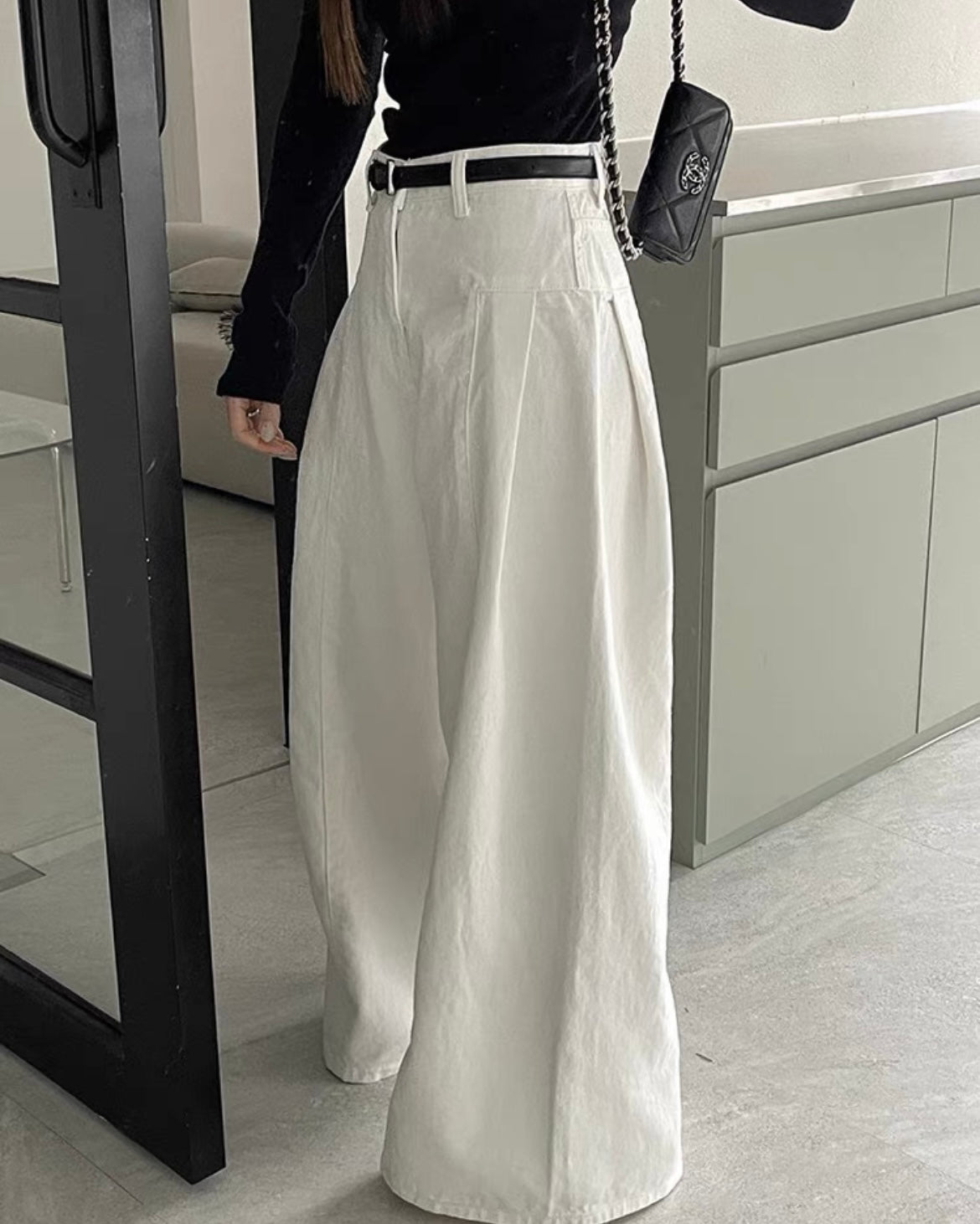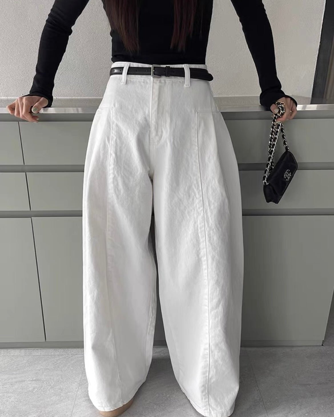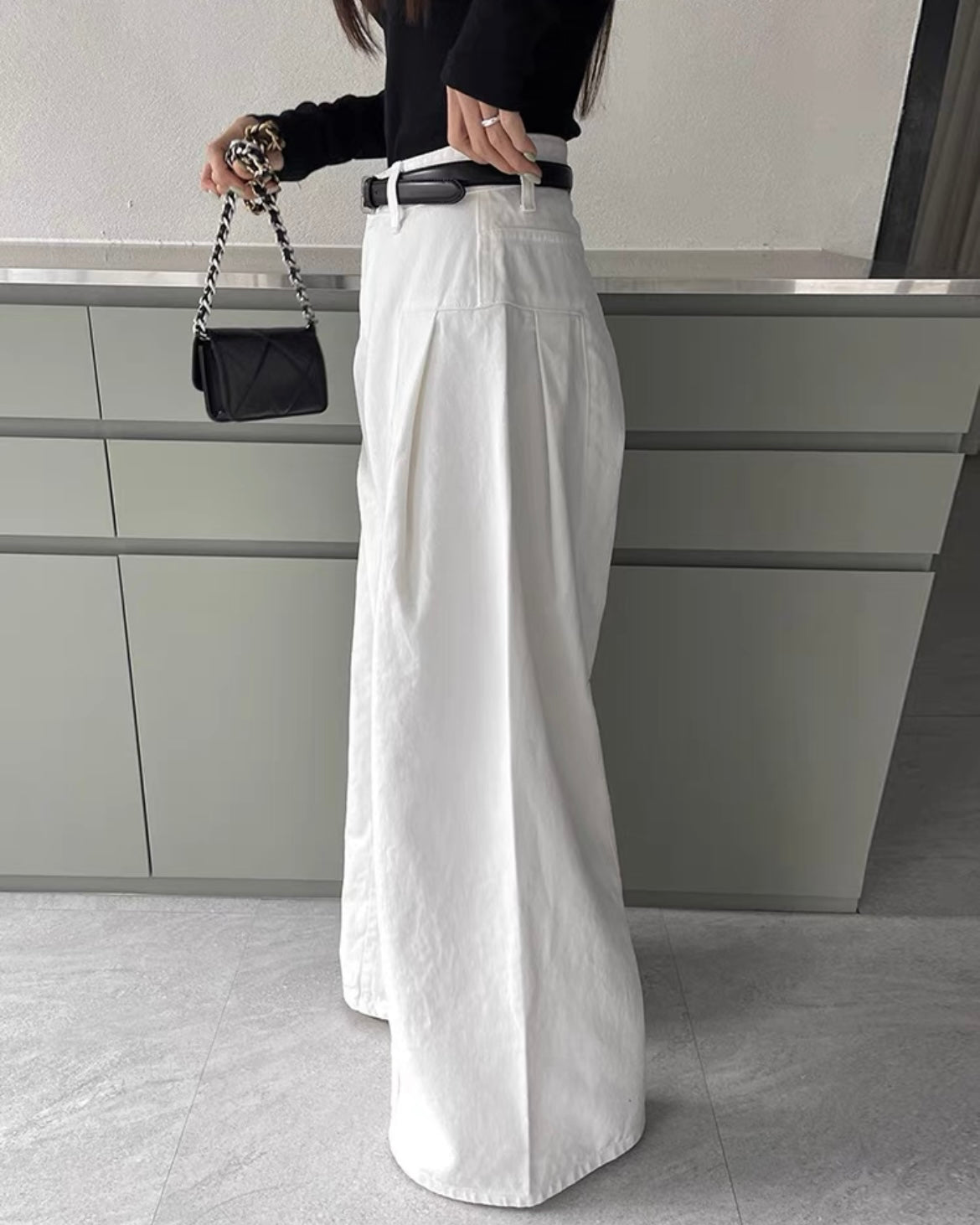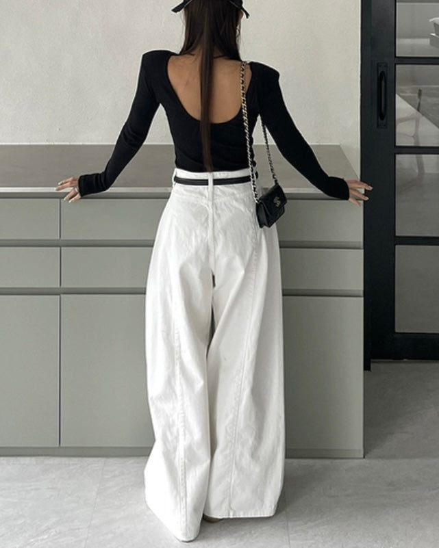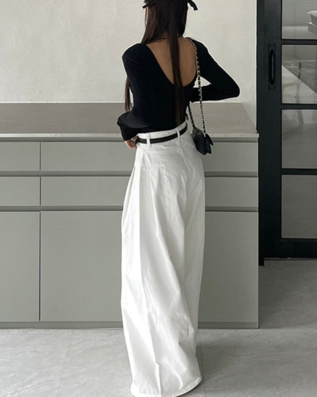 ハイウエストでワイドなシルエットなのでトップスをインさせたすっきりとしたスタイリングがおすすめです。