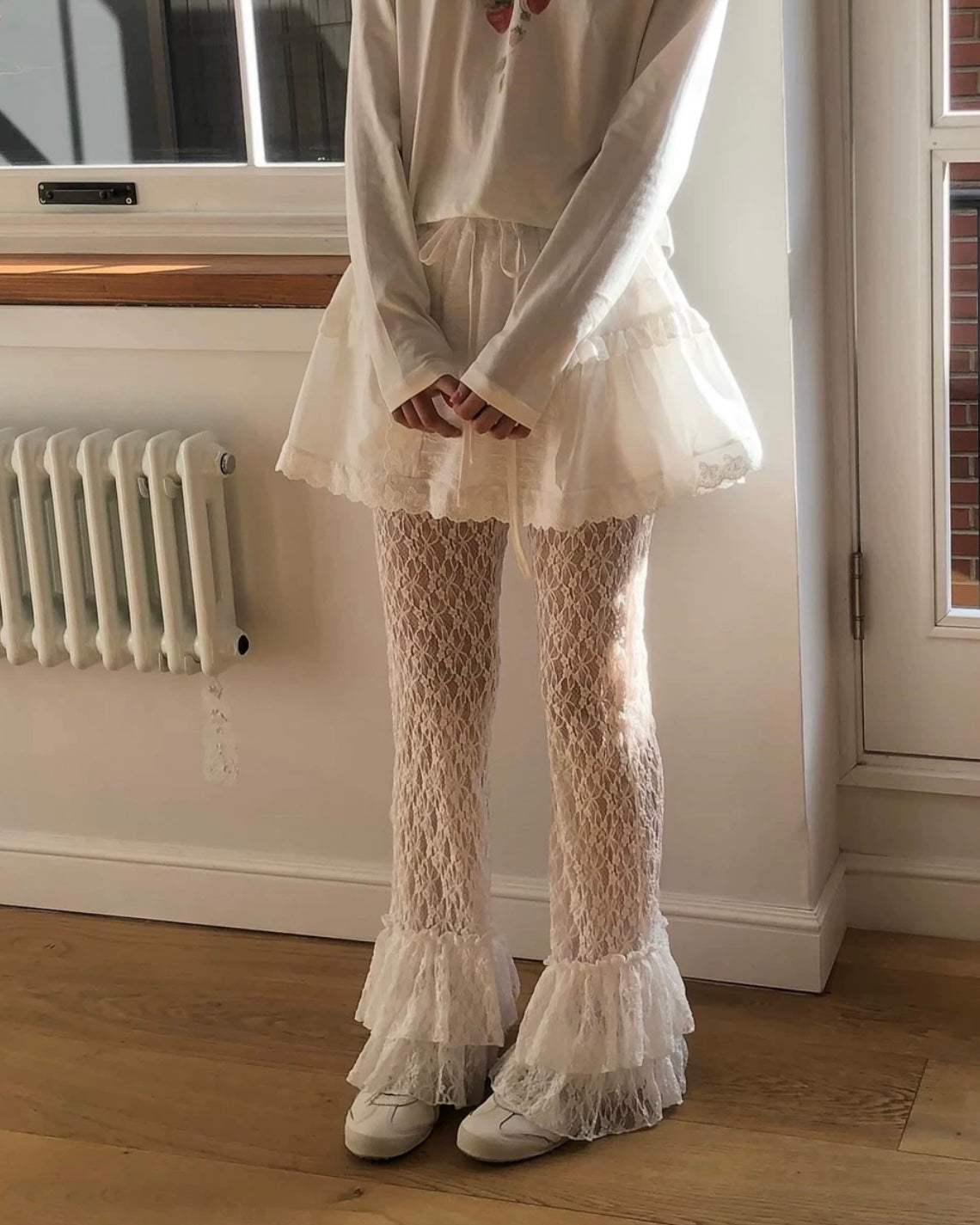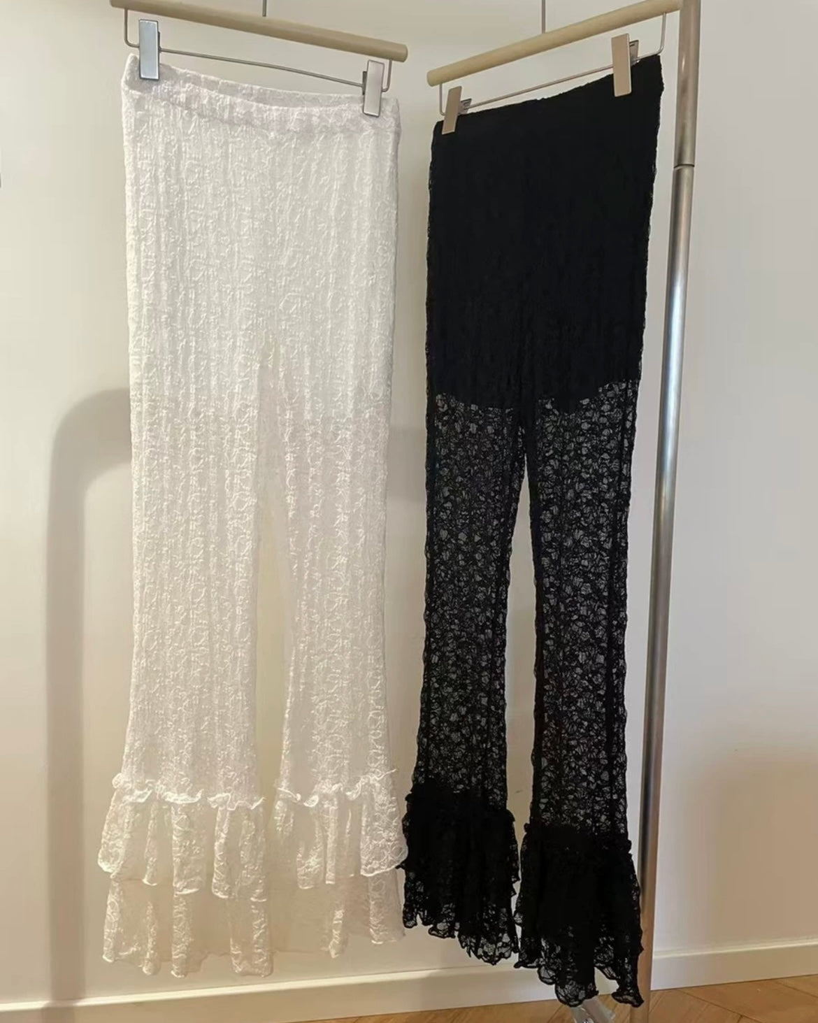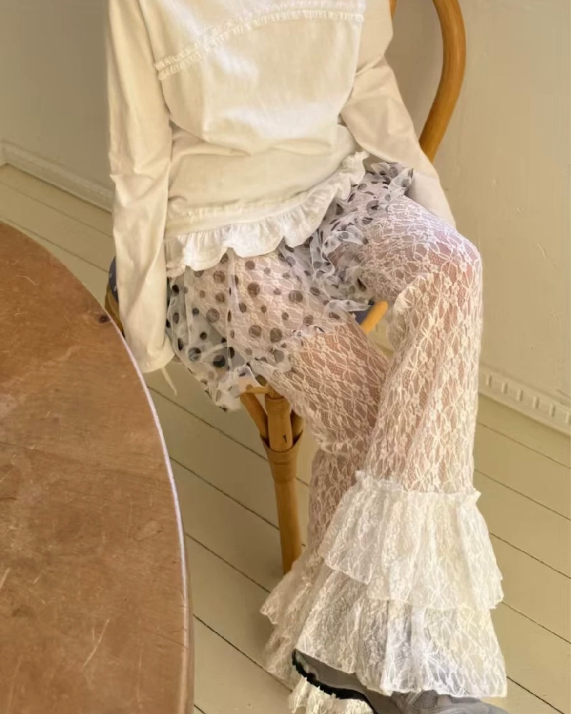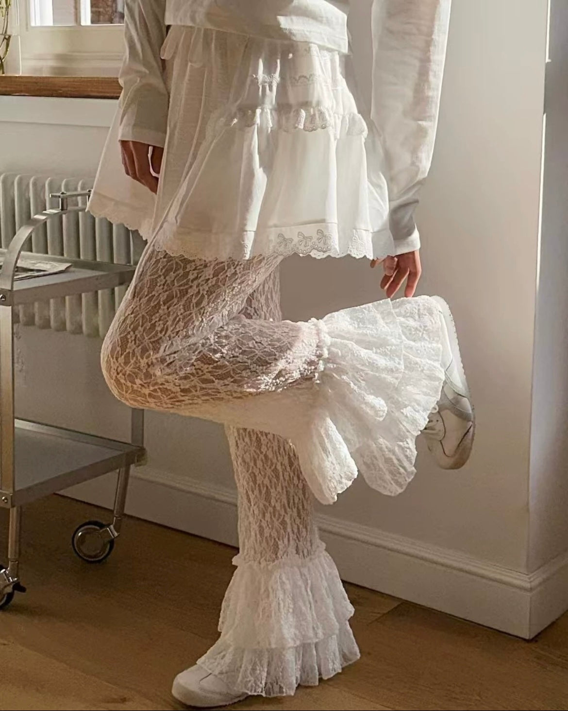 裾のフリルのボリューム感が可愛らしいレースパンツ。総レースの華やかさが目を惹くアイテム。