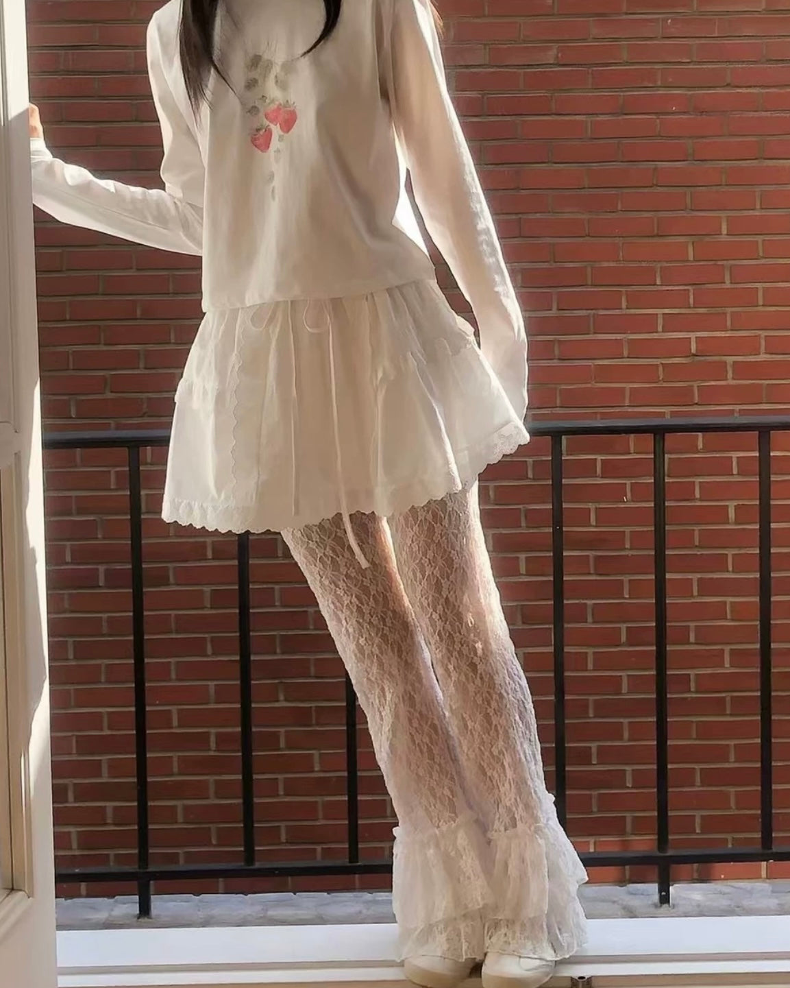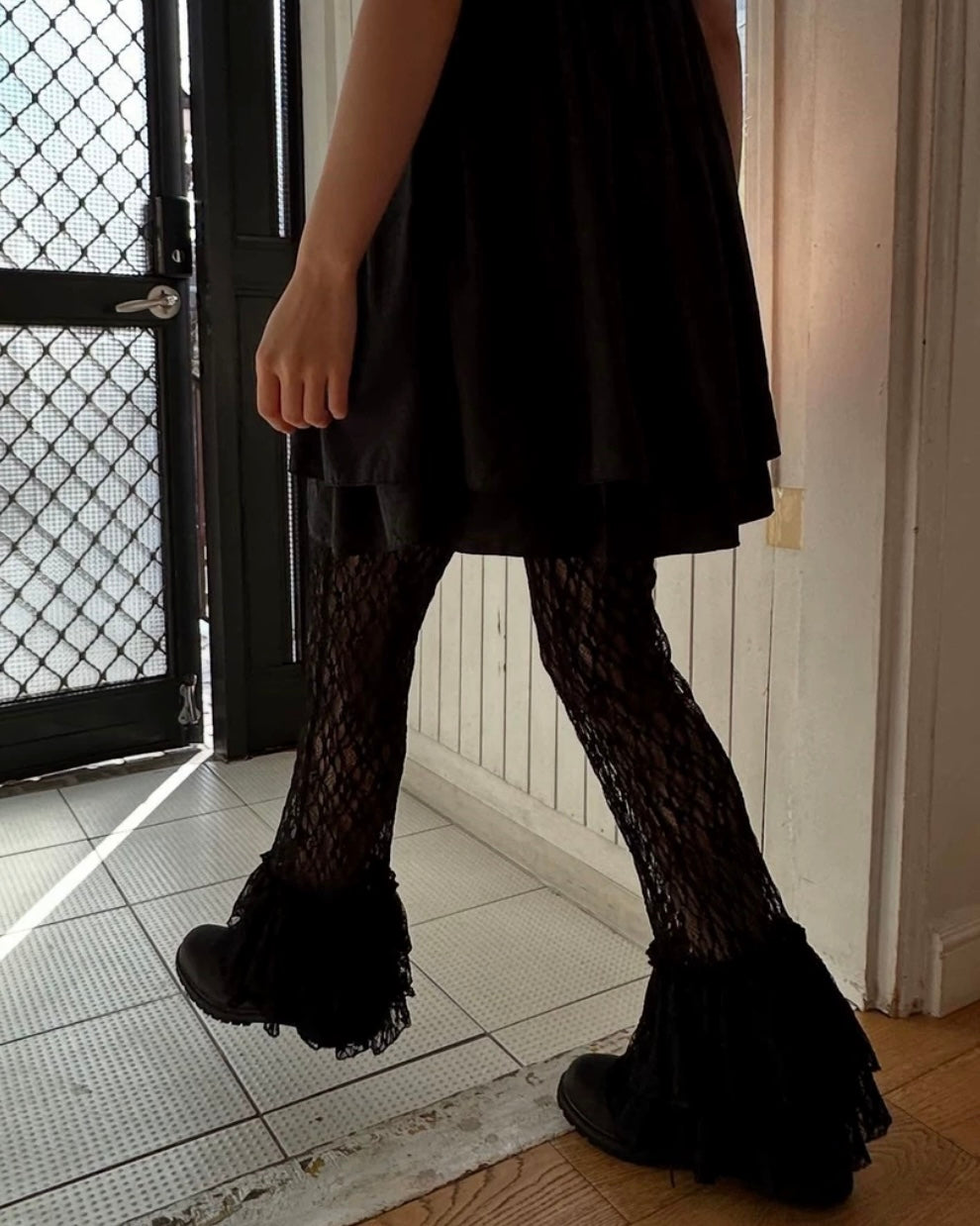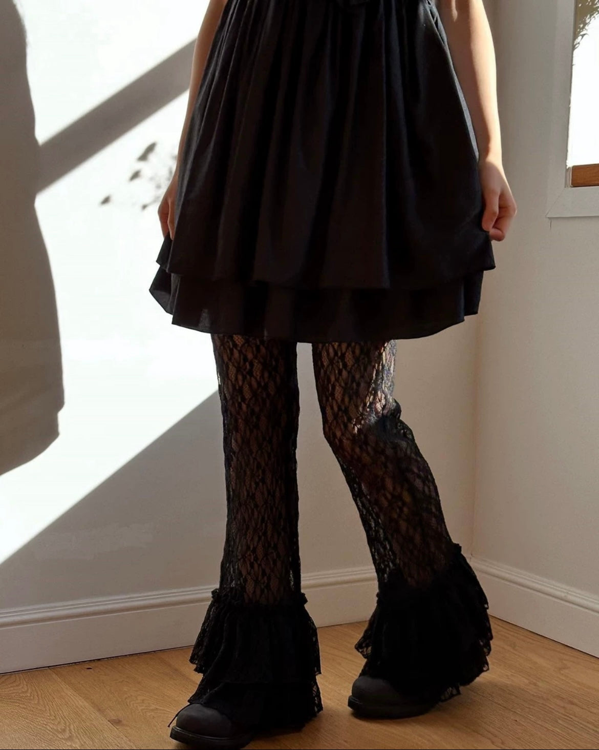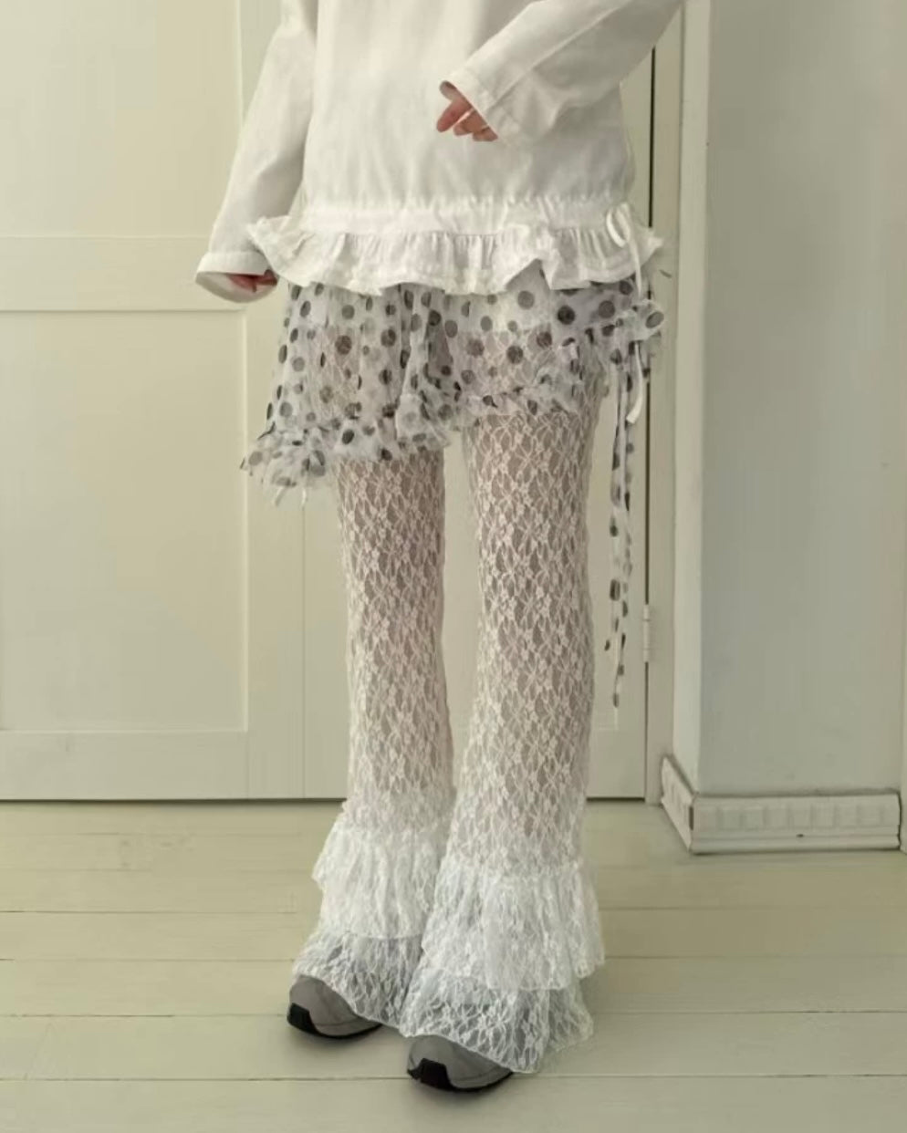 裾のフリルのボリューム感が可愛らしいレースパンツ。総レースの華やかさが目を惹くアイテム。