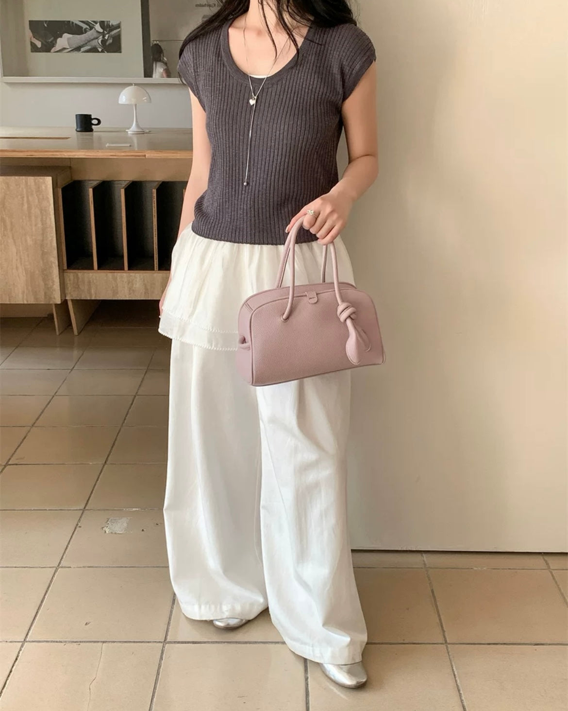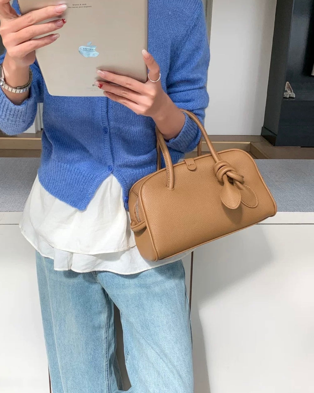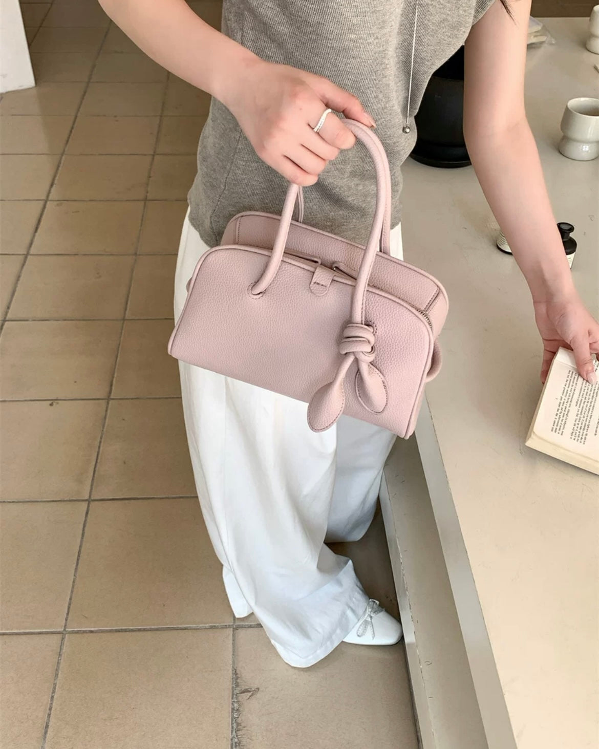 若干くすみのある色味展開が可愛らしい大人のカラーバッグ。シンプルになりすぎない絶妙デザインがスタイリングを完成させます。