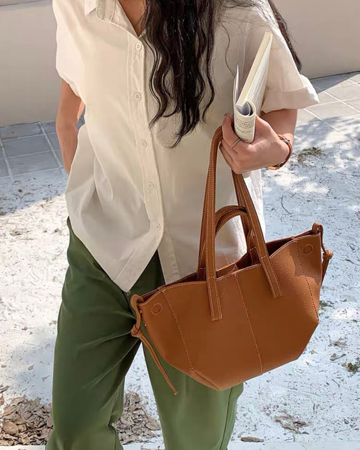 ワンカラーなデザインと、大きすぎず小さすぎないサイズ感なので様々なスタイリングに合わせやすく、オンオフ問わず使えます。
