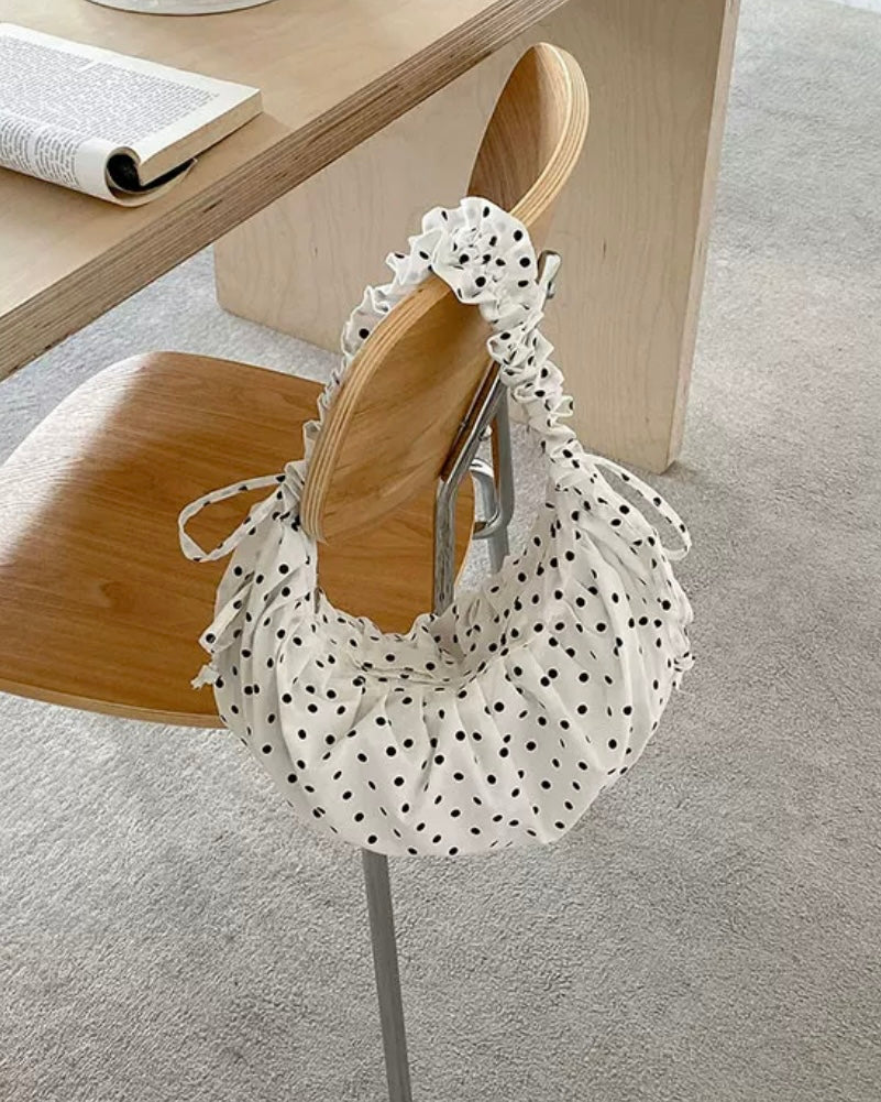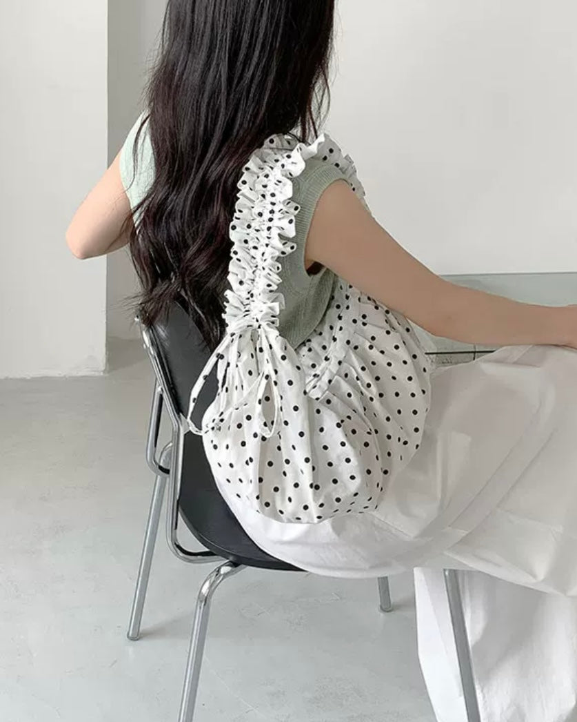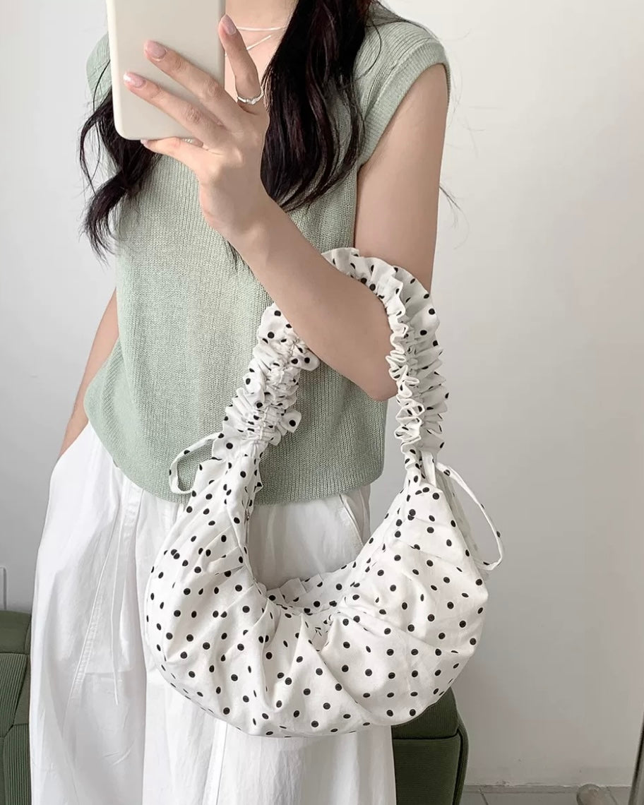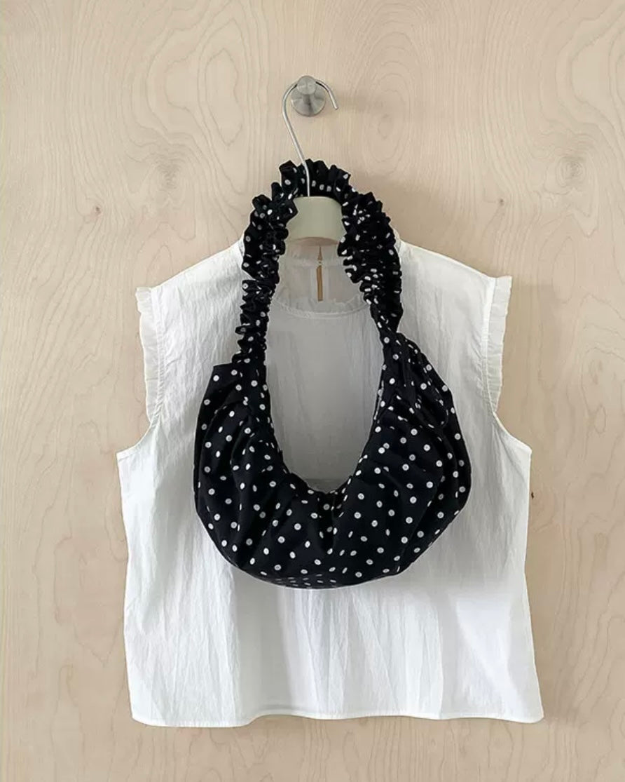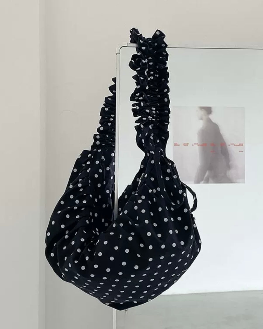 シンプルな形でありながらも間口のタックデザインや、小さめのドットが華やかで可愛らしく、幅広いスタイリングに合わせやすいアイテム。