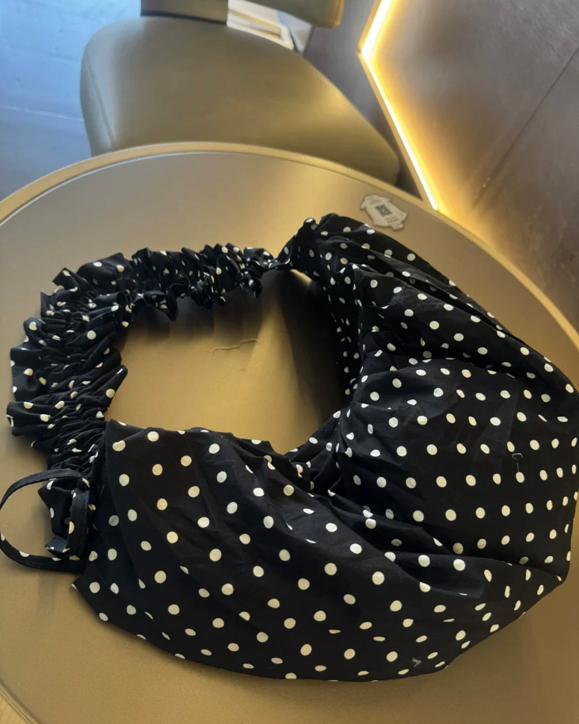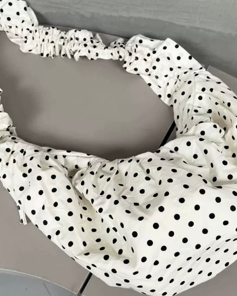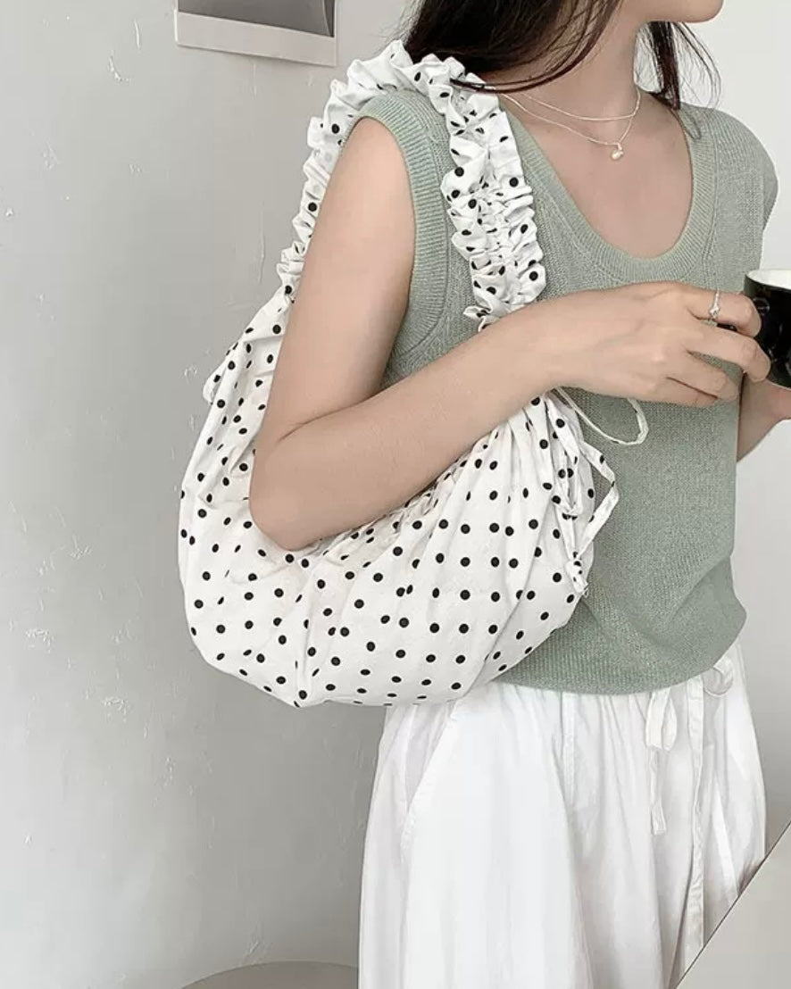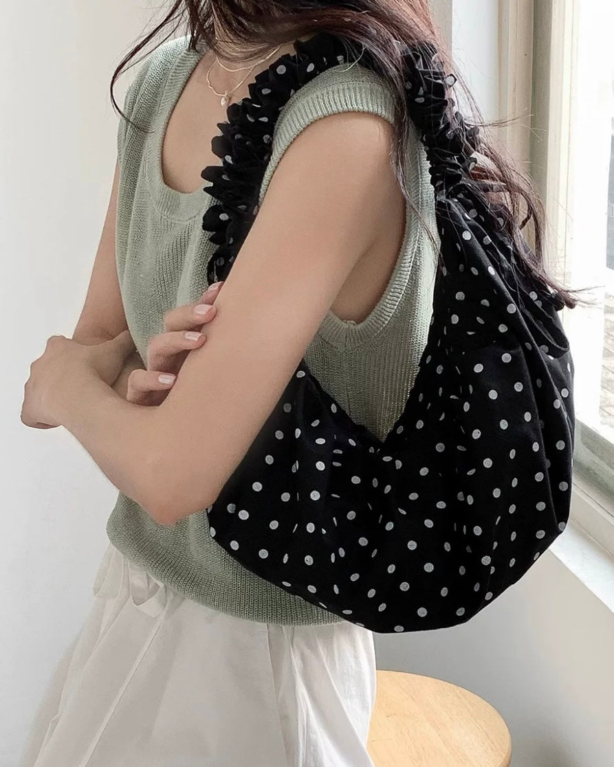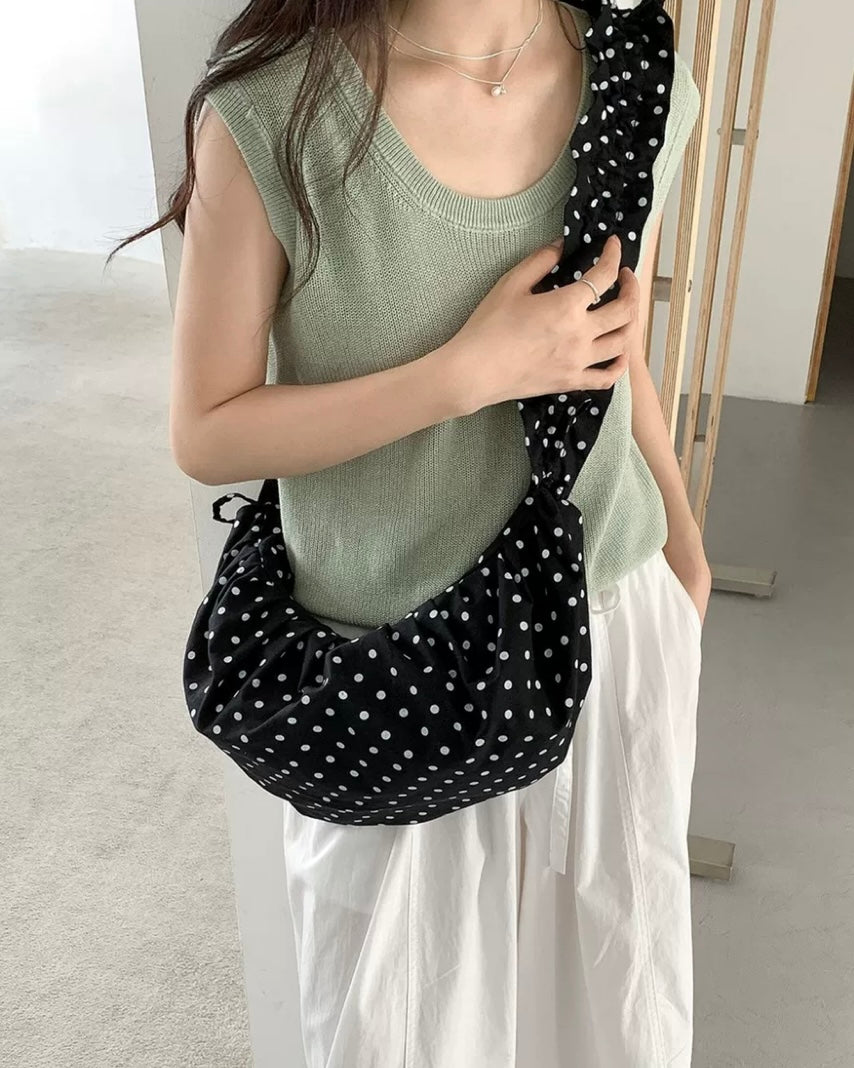 シンプルな形でありながらも間口のタックデザインや、小さめのドットが華やかで可愛らしく、幅広いスタイリングに合わせやすいアイテム。