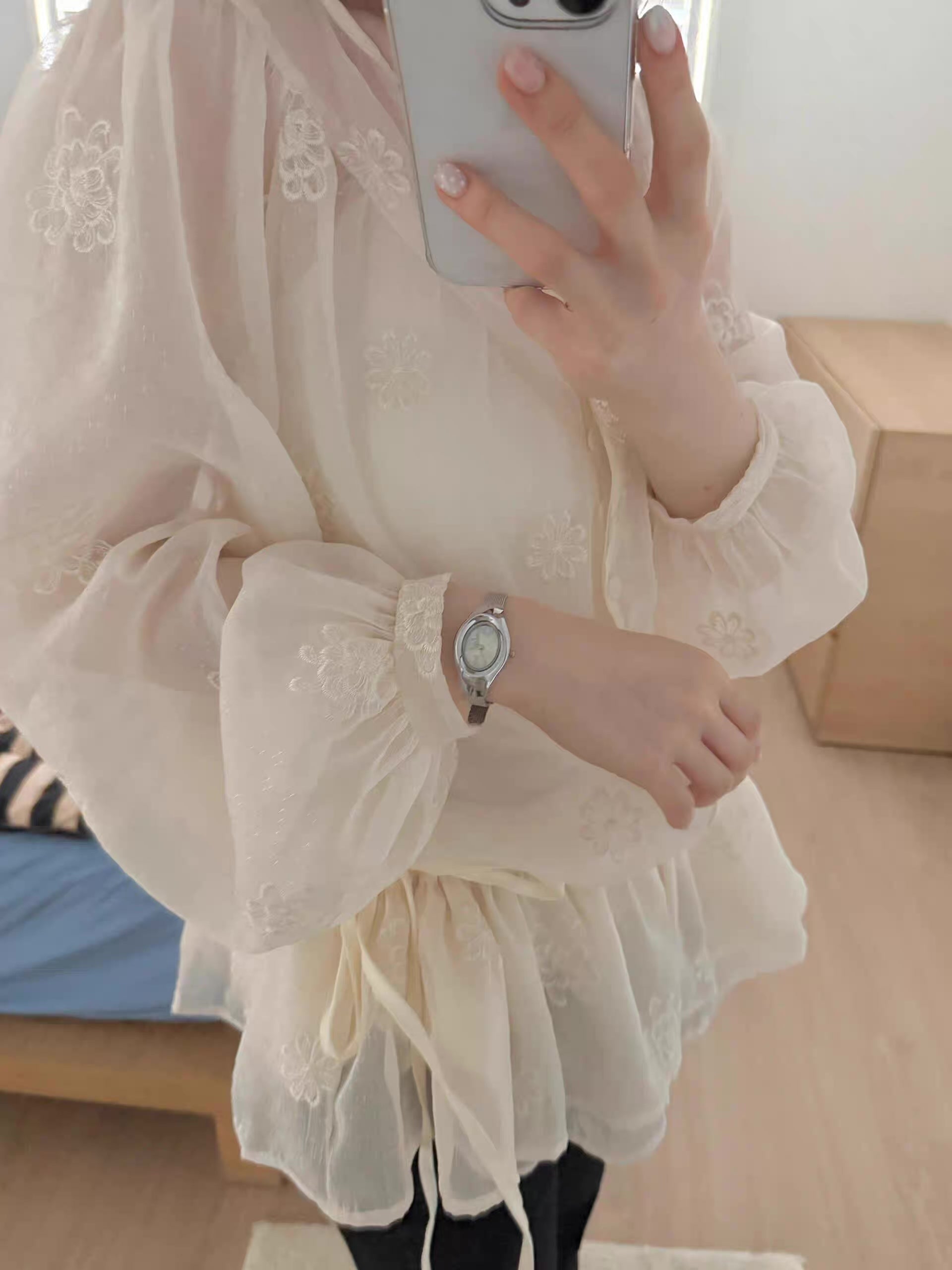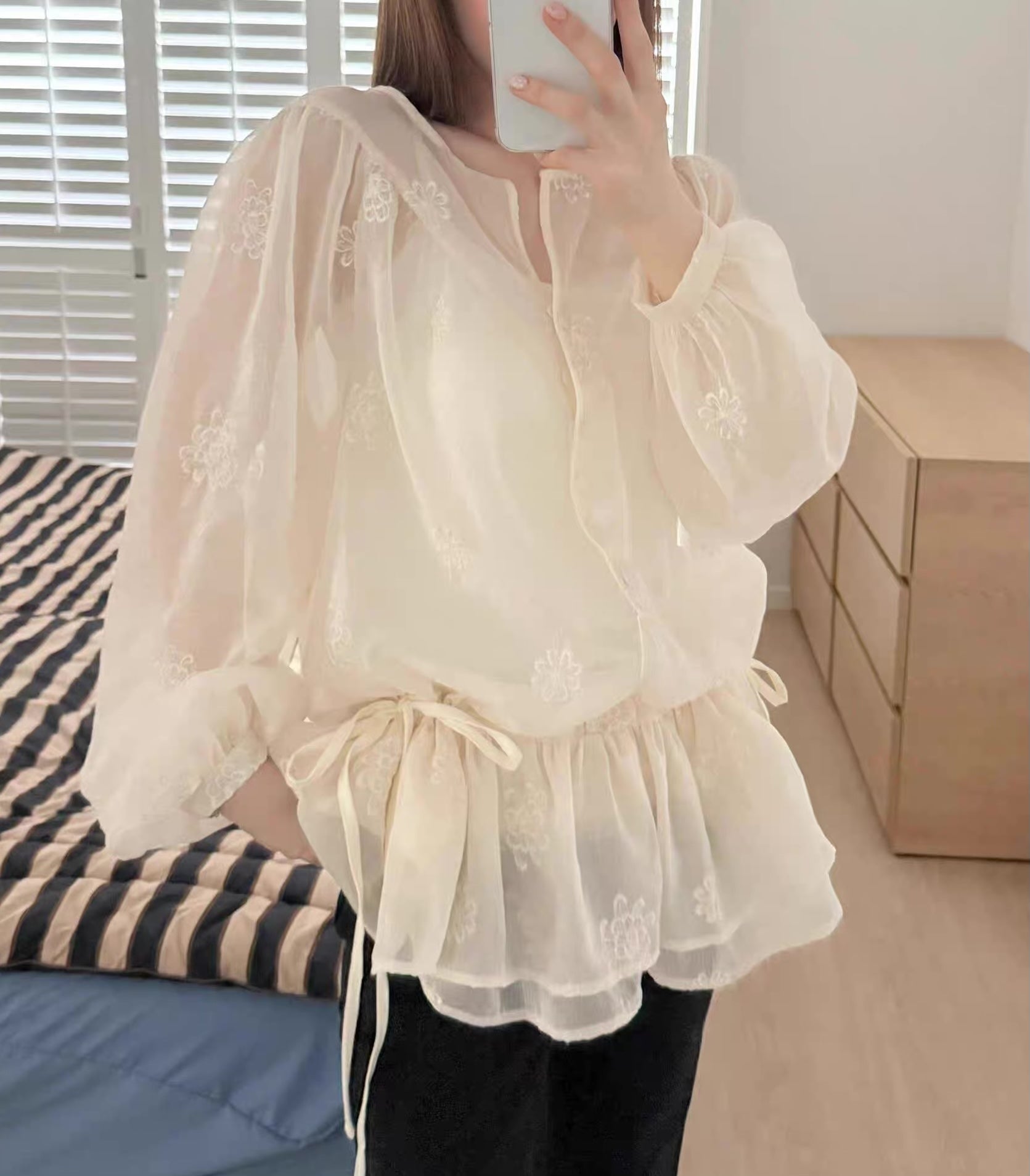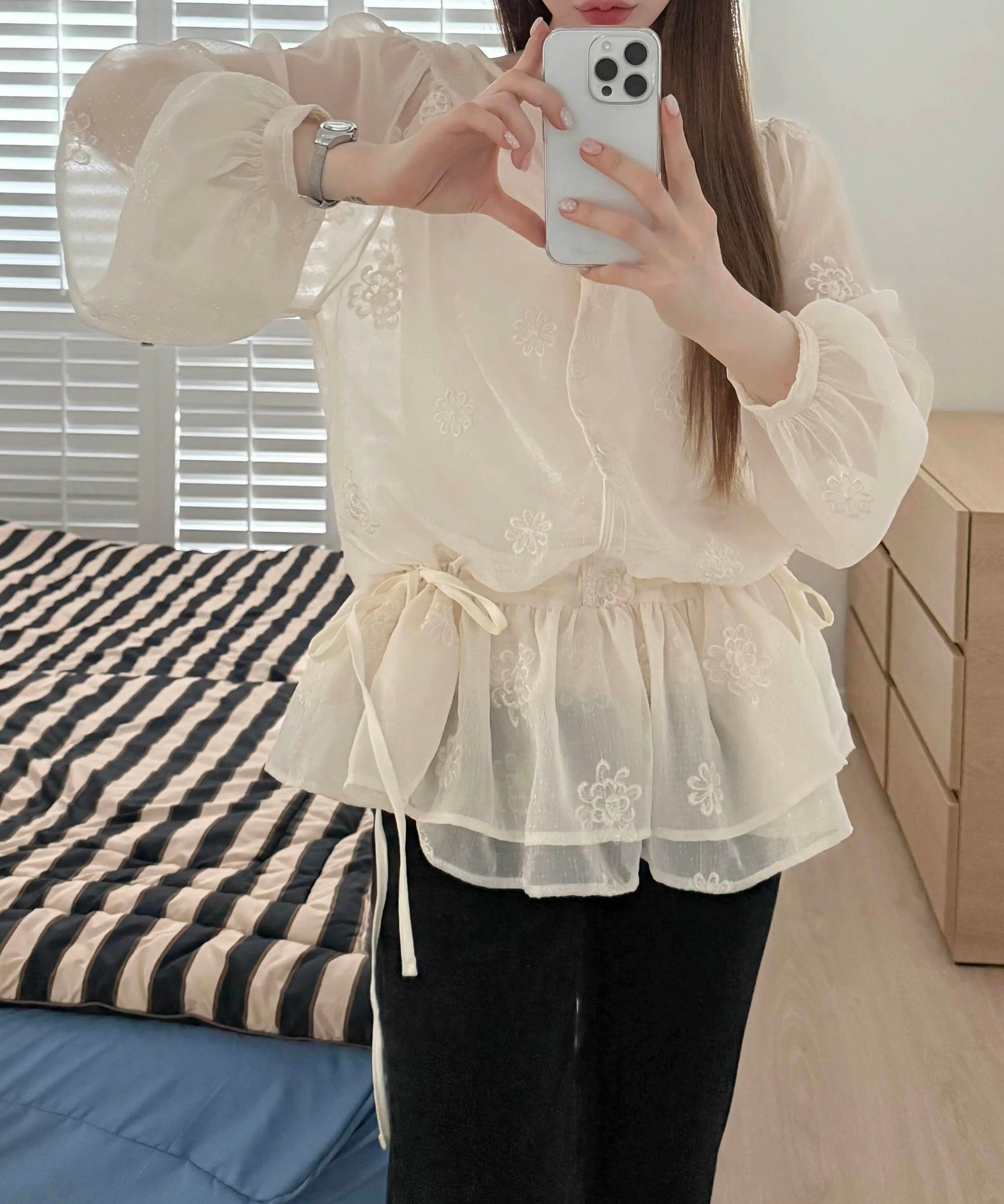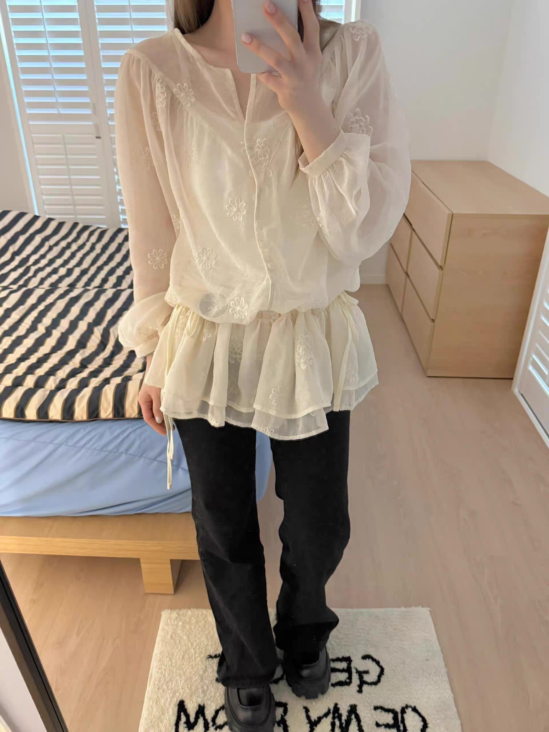 フラワー刺繍シアーブラウス