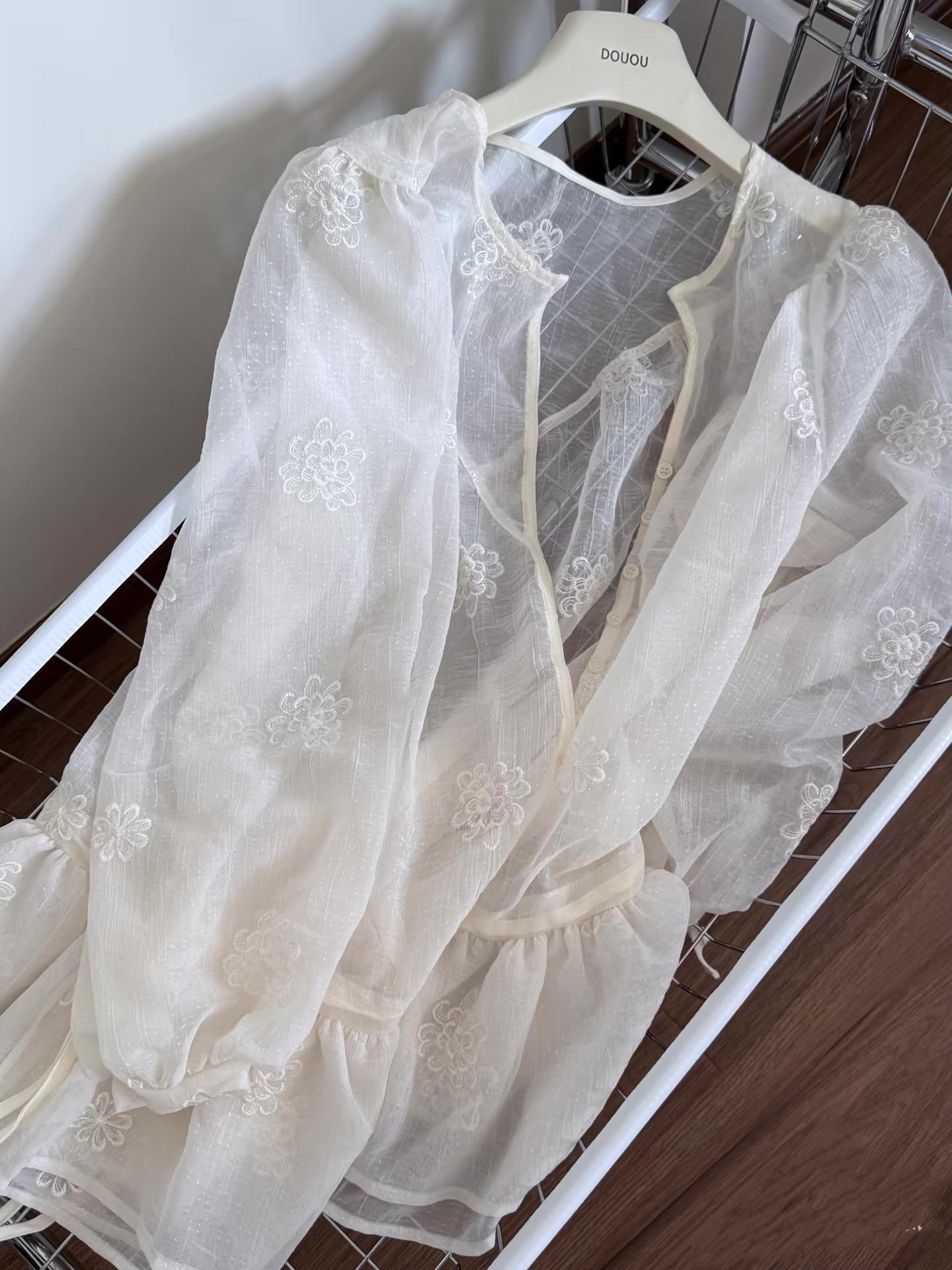 フラワー柄の刺繍を施した薄手の素材を使用。