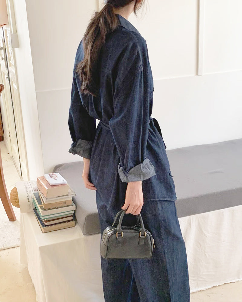 共紐ベルトでウエストマークすることでメリハリのあるシルエットに◎