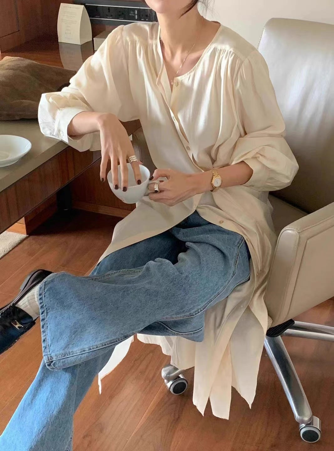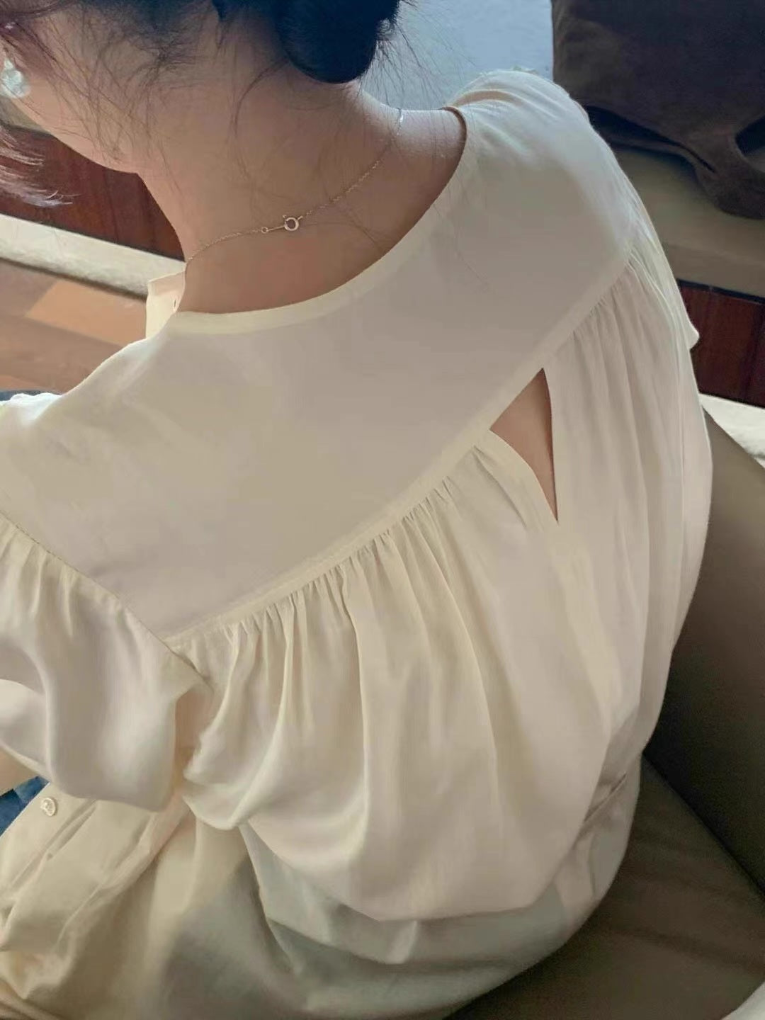 襟なしのクルーネックデザインなので顔周りをすっきりと見せてくれます。