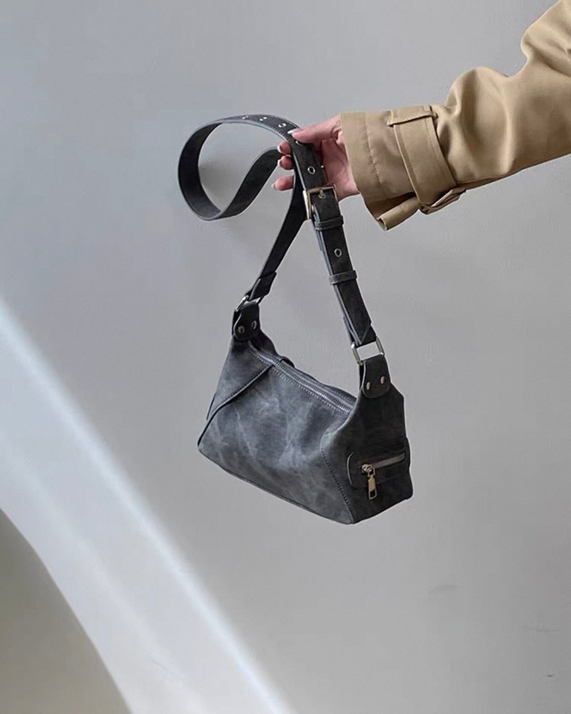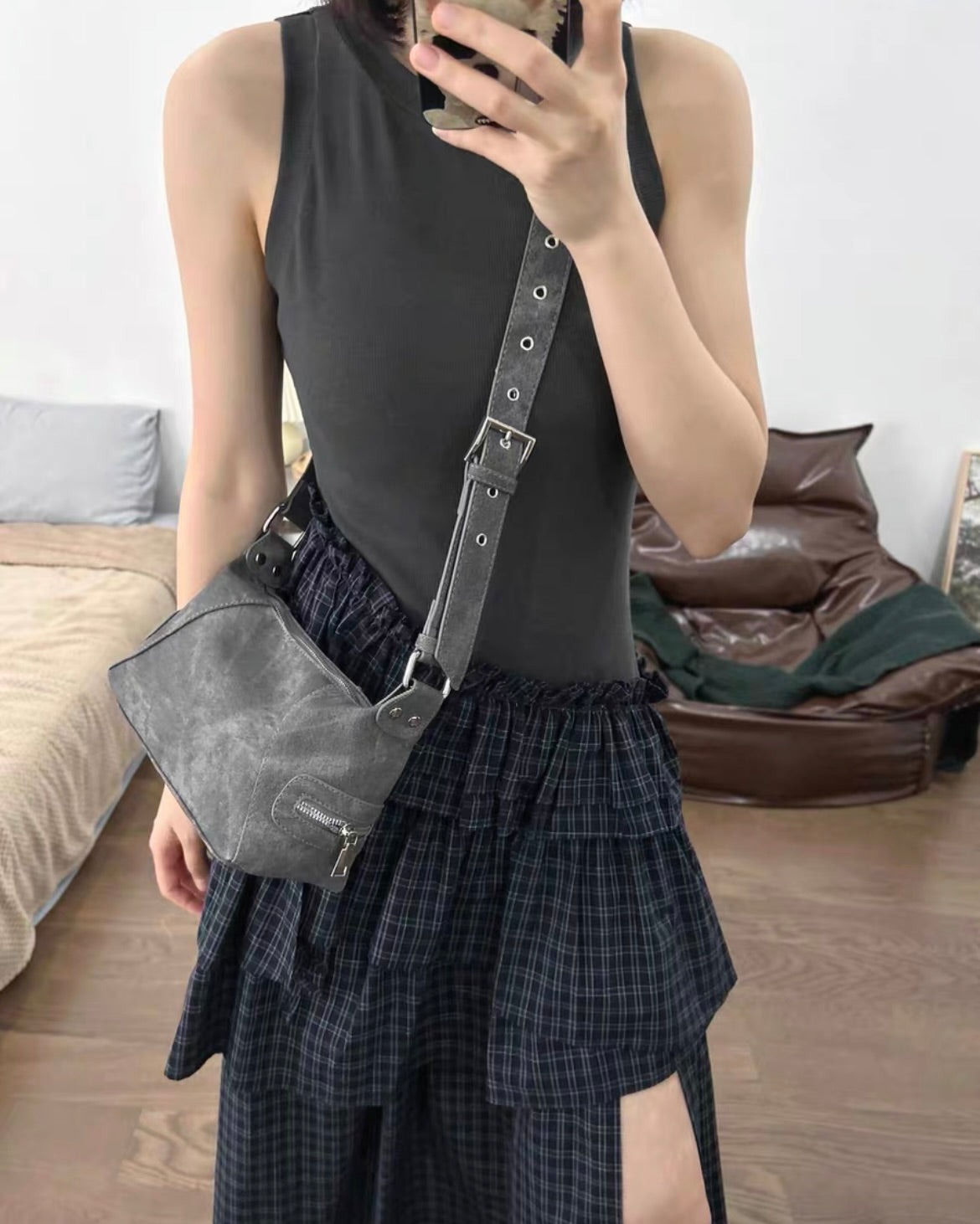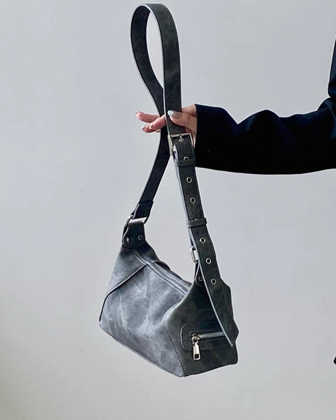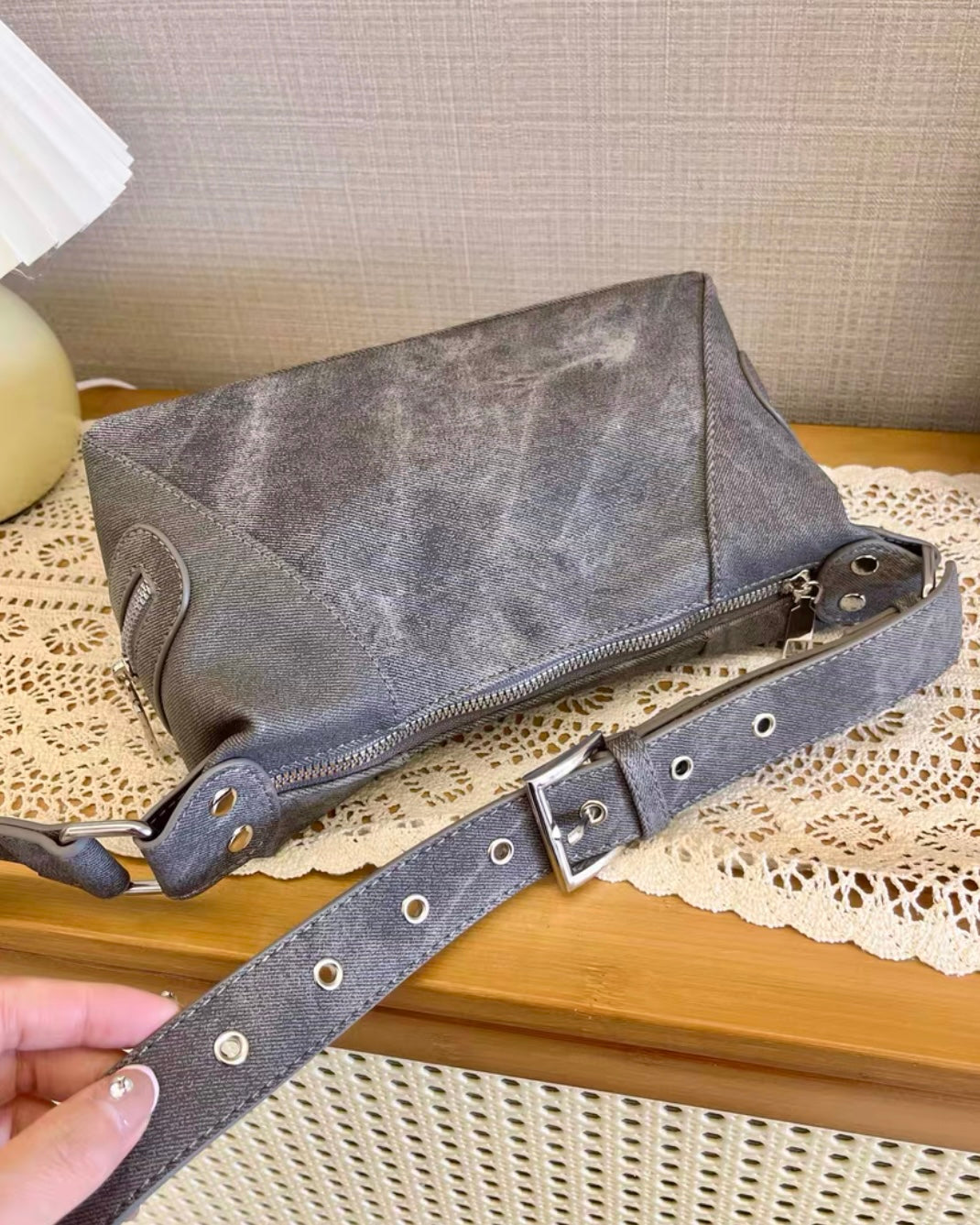 太めのベルトを採用したワンショルダーが今っぽく、黒デニムデザインがクールな印象に。