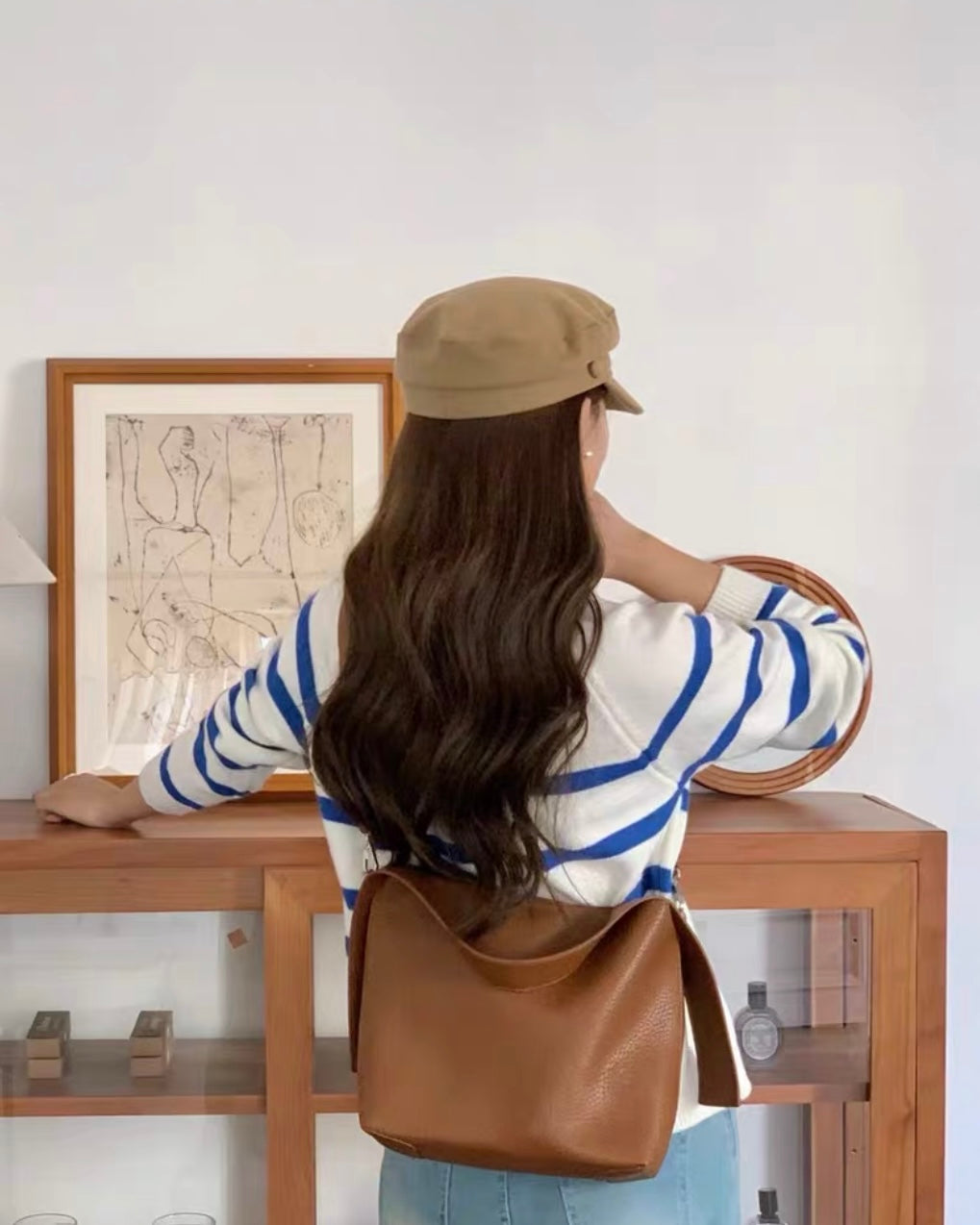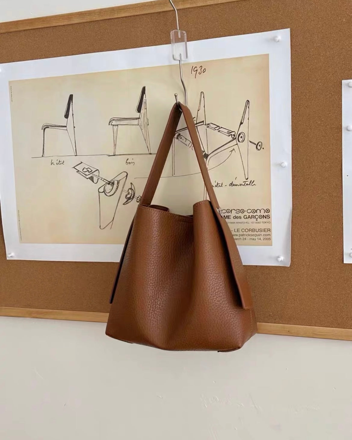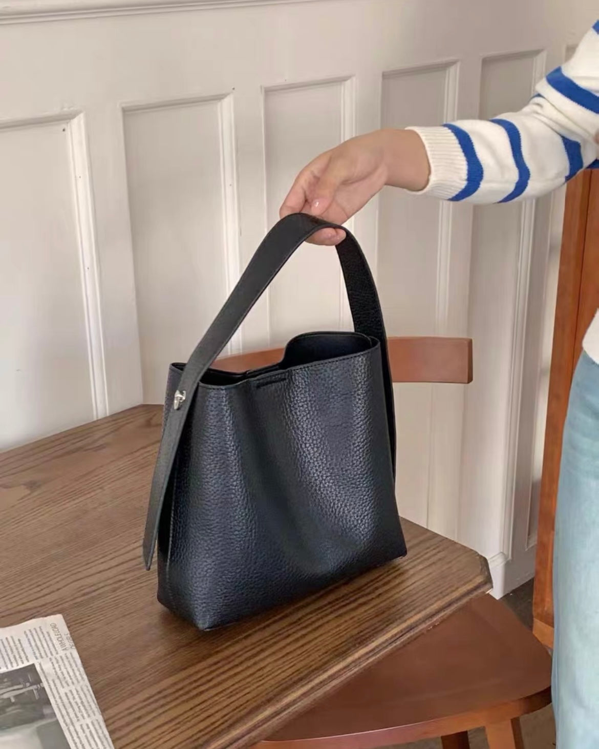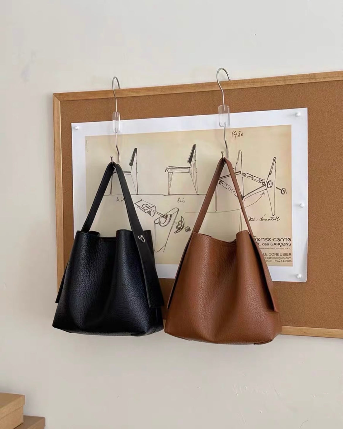 ハンドルの端が長めの作りになっているのでリボンのようなデザインと、細かなシボ感があり触り心地も柔らかく、くたっとしたシルエットも可愛い。